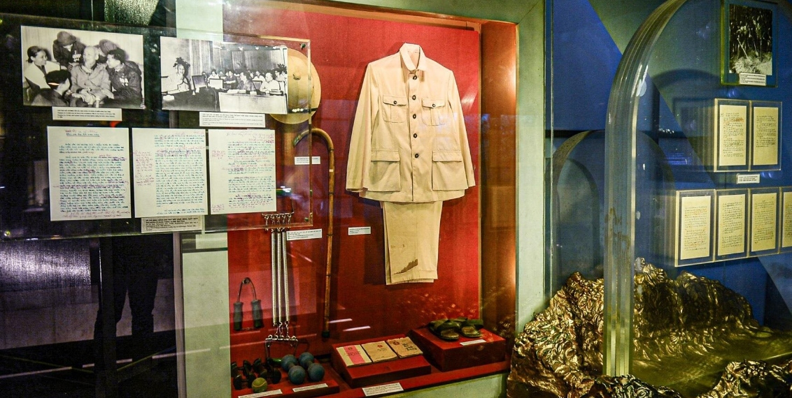 Nội dung thứ 2 là Đất nước và cuộc đấu tranh của Nhân dân Việt Nam chống xâm lược bảo vệ Tổ quốc trong thời đại Hồ chí Minh, gồm 6 hình tượng. Trong ảnh là bộ quần áo kaki, chiếc mũ cối và những kỷ vật gắn liền với cuộc đời cách mạng của Chủ tịch Hồ Chí Minh.