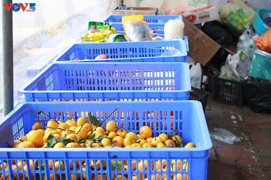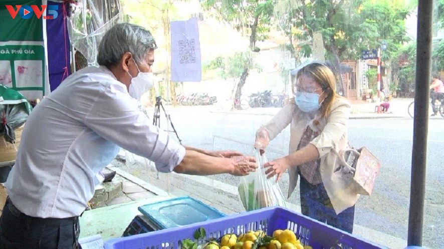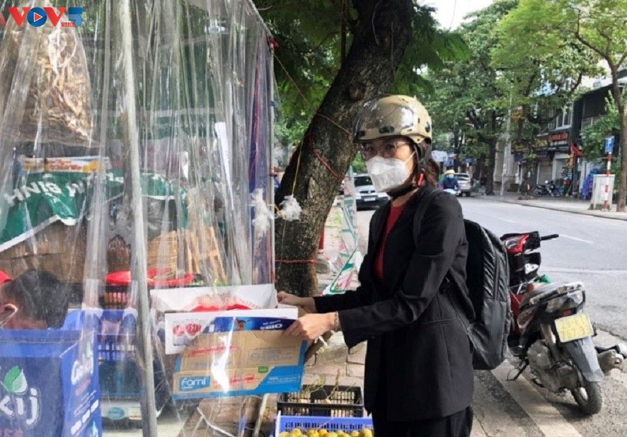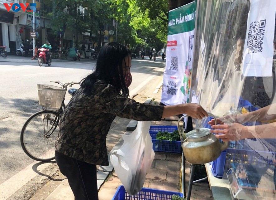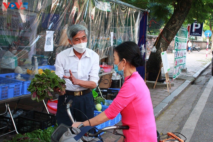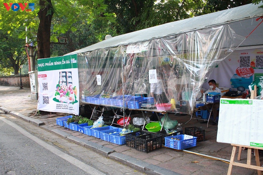 Gian hàng cung cấp thực phẩm tại ngã ba Văn Miếu – Quốc Tử Giám là địa chỉ nhận nhu yếu phẩm quen thuộc của người dân nơi đây khi khu phố này nằm trong vùng đỏ (vùng có nguy cơ lây nhiễm COVID-19 cao) ở Thủ đô.
