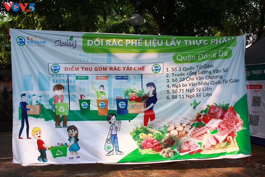 Từ cuối tháng 9, người dân trên địa bàn quận Đống Đa, Hà Nội đã quen thuộc với điểm cung cấp thực phẩm số 3 Văn Miếu. Điều đặc biệt là khi đến đây, người dân có thể đổi phế liệu để lấy thực phẩm sạch. Đây là ý tưởng sáng tạo được Công ty Cổ phần Tư vấn kinh tế và phát triển nông thôn Việt Nam triển khai rải rác trên địa bàn Thủ đô. Những gian hàng “đổi rác phế liệu lấy thực phẩm” ở Hà Nội không chỉ hỗ trợ người có hoàn cảnh khó khăn bị ảnh hưởng bởi dịch COVID-19, mà còn truyền đi những thông điệp mang ý nghĩa nhân văn sâu sắc, kêu gọi mọi người cùng chung tay bảo vệ môi trường.