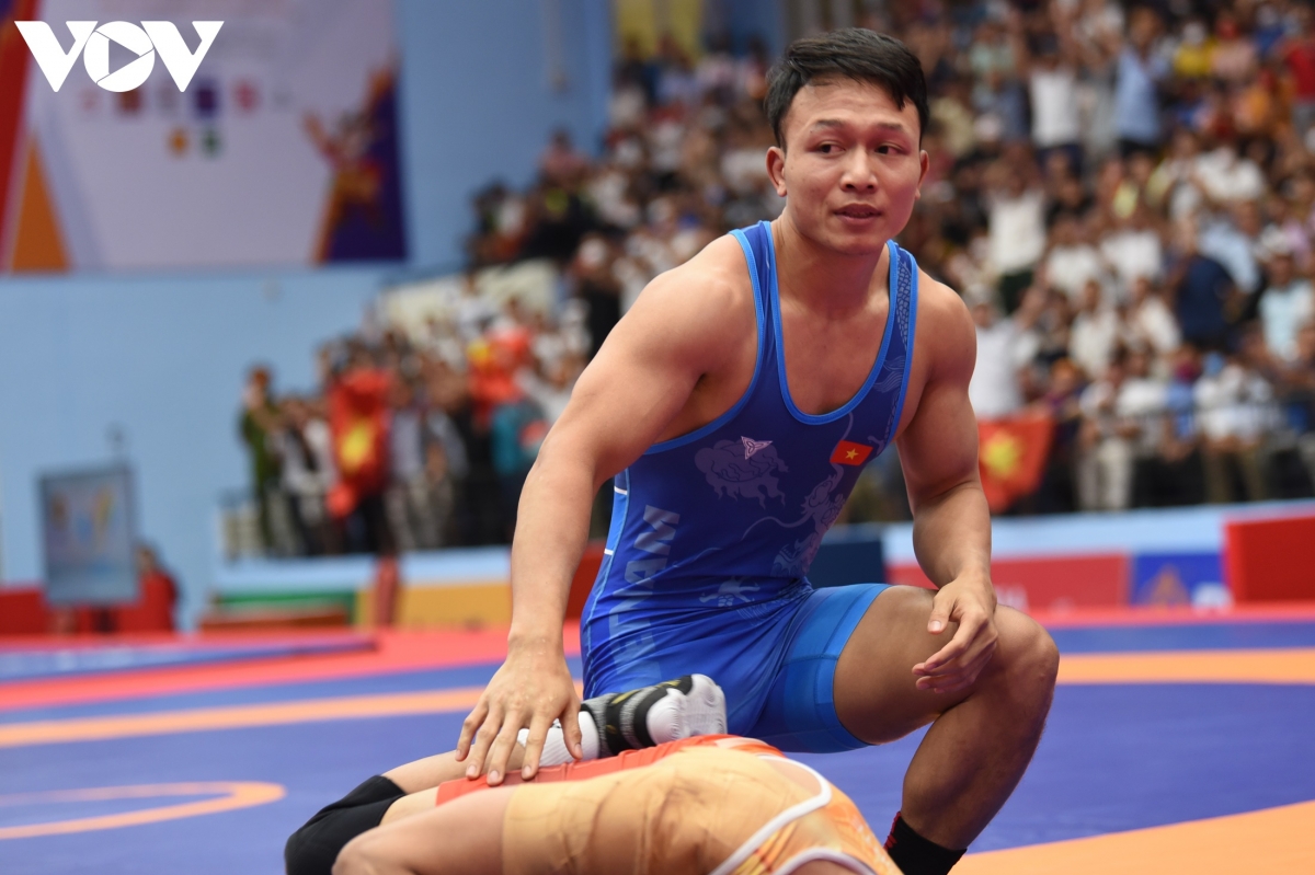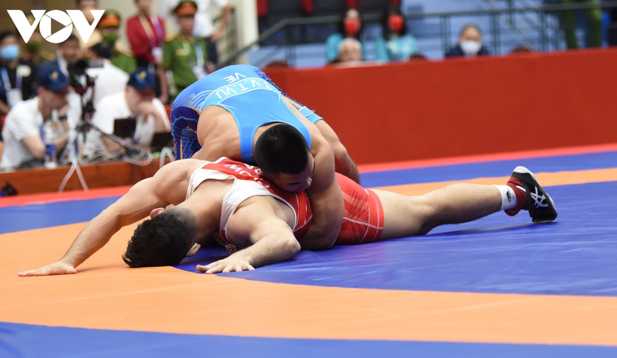 Trước đó, vào sáng nay, đô vật Hoàng Văn Nam chơi xuất sắc để bước lên bục cao nhất ở hạng cân 97kg sau trận chung kết thuận lợi với nam vận động viên từ Campuchia.