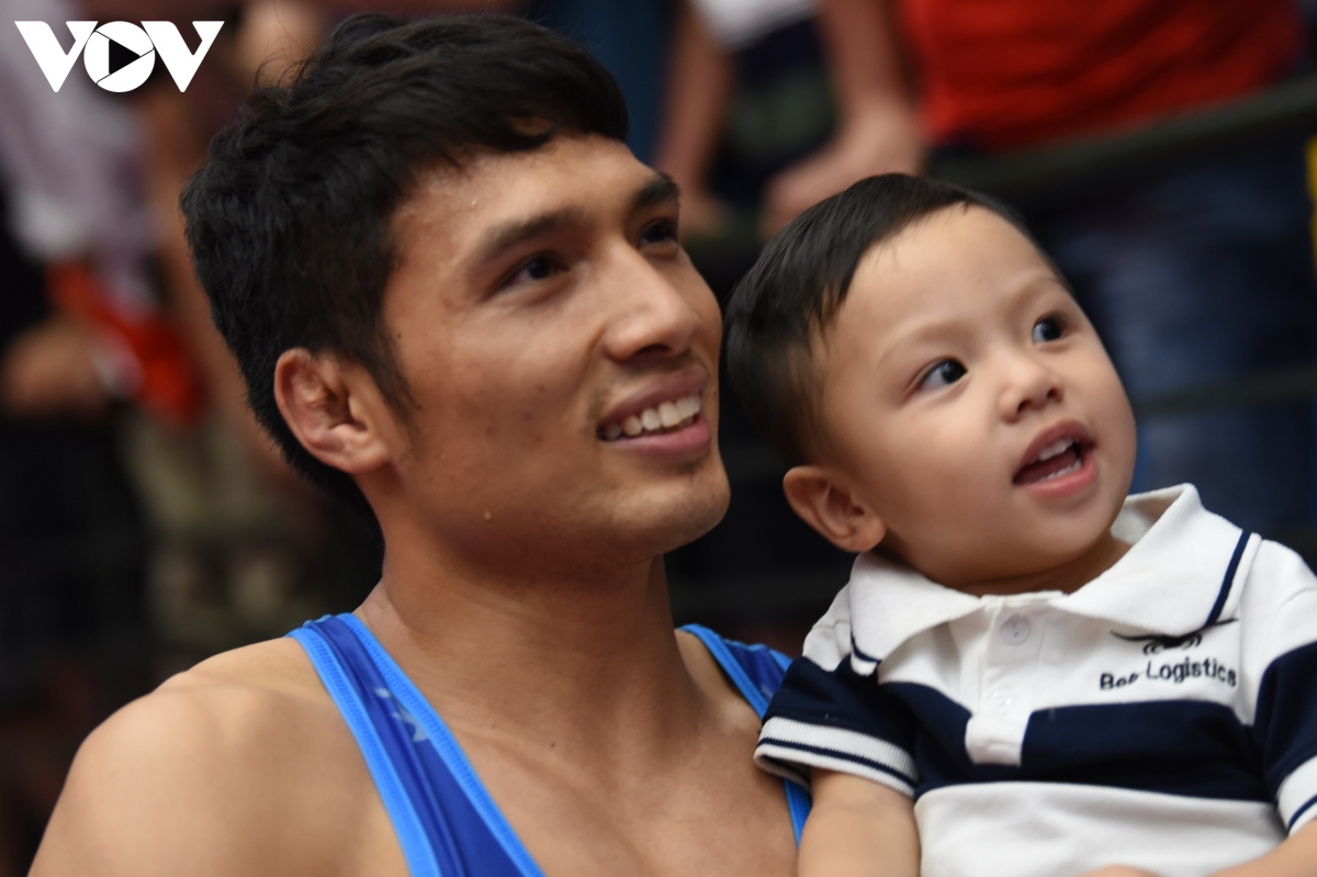 Đô vật Nguyễn Xuân Định ăn mừng HCV cùng người thân trong gia đình.