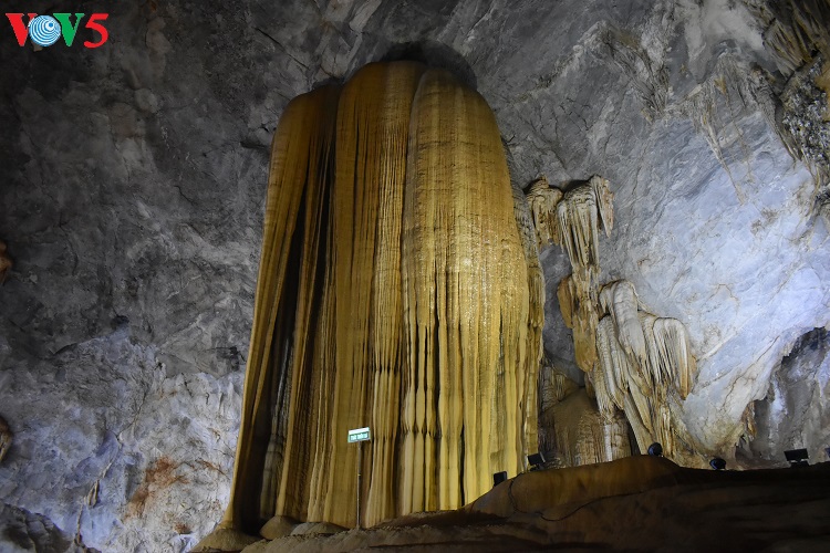 Khối thạch nhũ cao lớn như một dòng thác đổ sừng sững có tên là thác Thiên Hà. |