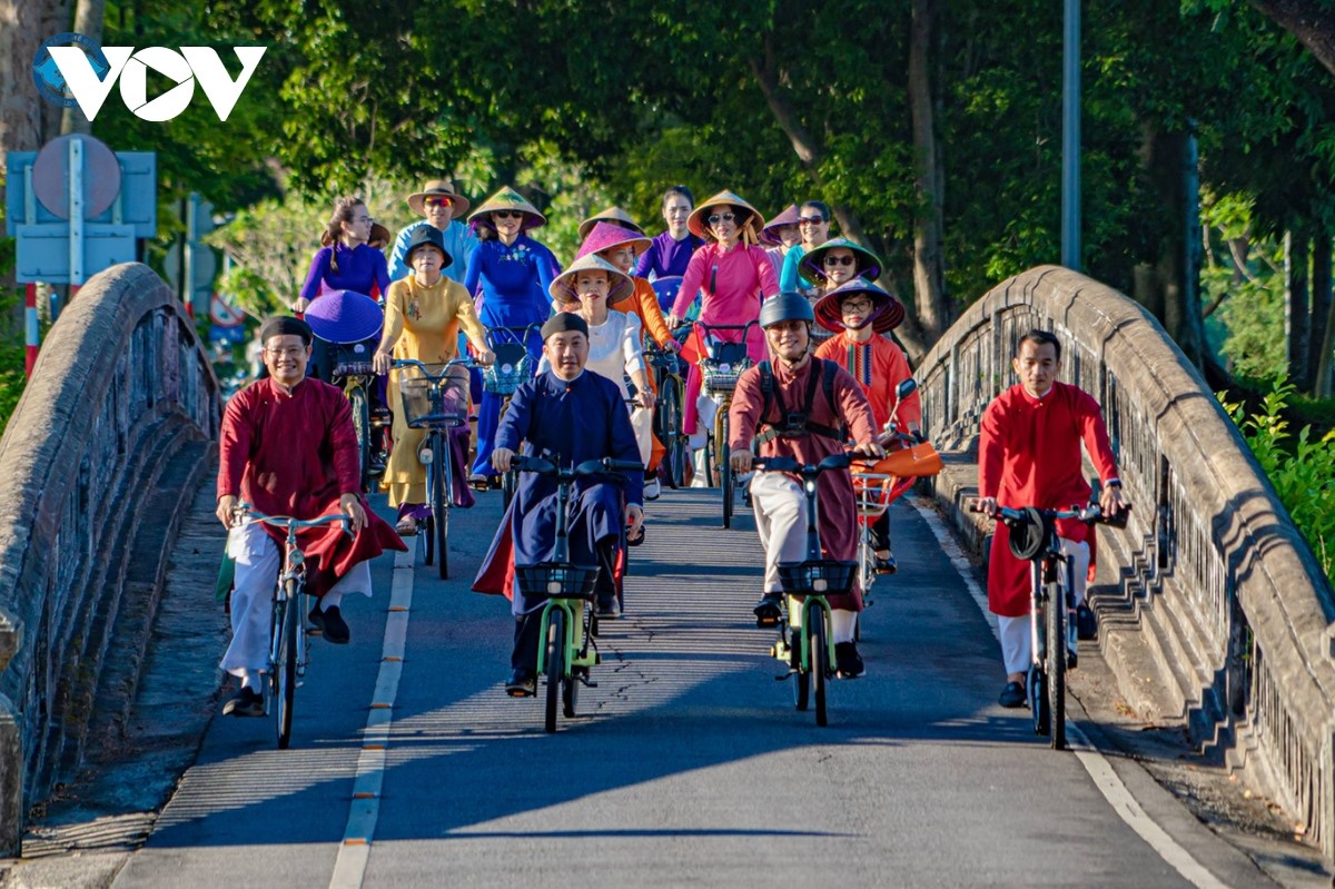 Tri thức may, mặc áo dài Huế trở thành Di sản văn hóa phi vật thể quốc gia. (Trong ảnh: Mặc Áo dài Huế trong hoạt động đạp xe vì môi trường. Ảnh: Vinh Thông/VOV) |