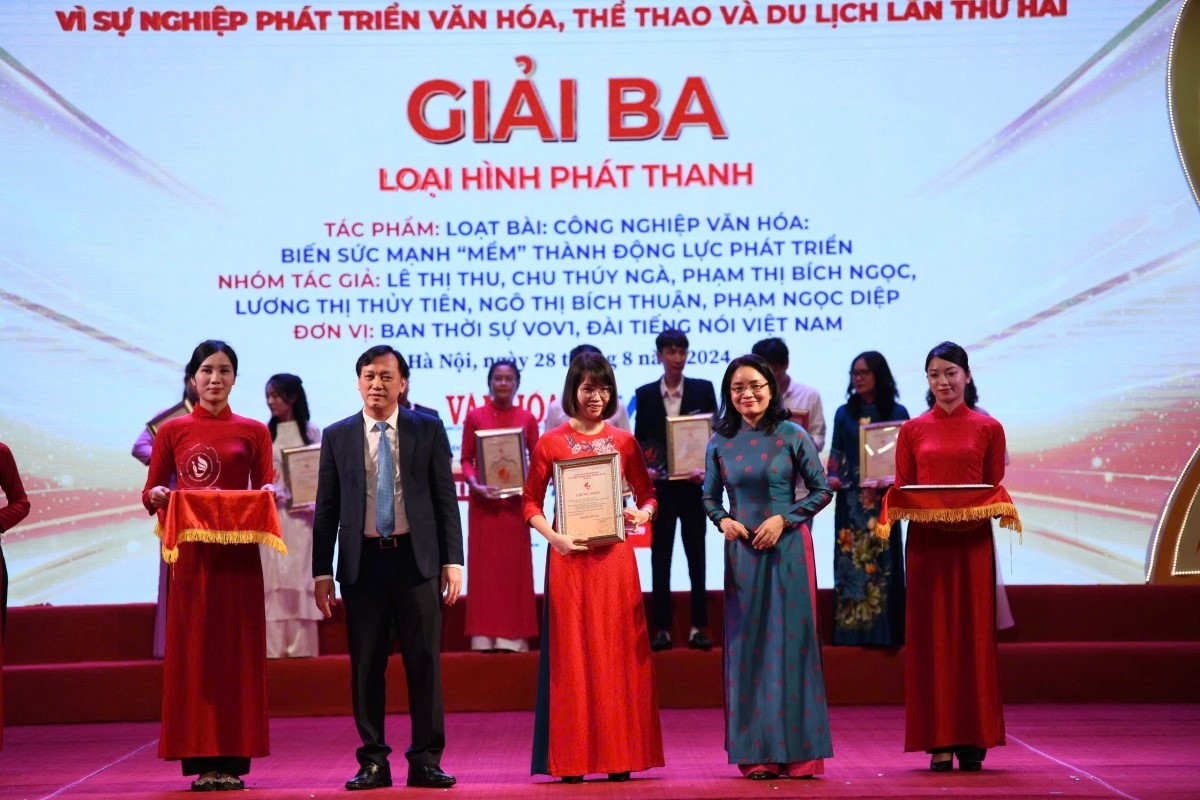 Loạt bài “Công nghiệp văn hóa: Biến sức mạnh “mềm” thành động lực phát triển” của nhóm tác giả Lê Thu, Chu Thúy Ngà, Phạm Thị Bích Ngọc, Lương Thị Thủy Tiên, Ngô Thị Bích Thuận, Phạm Ngọc Diệp, Ban Thời sự VOV1, Đài Tiếng nói Việt Nam giành giải Ba loại hình phát thanh. Ảnh: VOV |