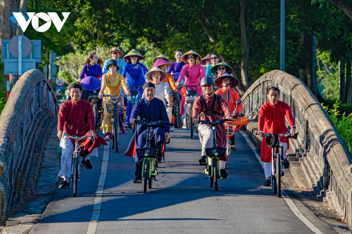 Ở loại hình Tri thức dân gian, có Phở Hà Nội, Phở Nam Định, Mỳ Quảng (Quảng Nam), Tri thức may, mặc áo dài Huế (Thành phố Huế, tỉnh Thừa Thiên Huế), Nghệ thuật trang trí cây nêu của người Co (huyện Trà Bồng, Quảng Ngãi). (Trong ảnh: Mặc Áo dài Huế trong hoạt động đạp xe vì môi trường. Ảnh: Vinh Thông/VOV) |