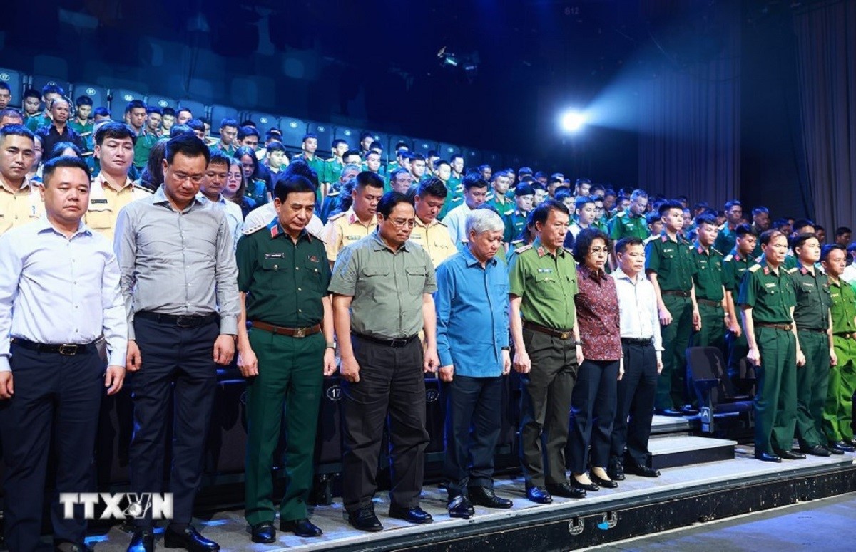 Thủ tướng Phạm Minh Chính và các đại biểu mặc niệm đồng bào tử nạn do ảnh hưởng của cơn bão số 3. Ảnh: Dương Giang/TTXVN |