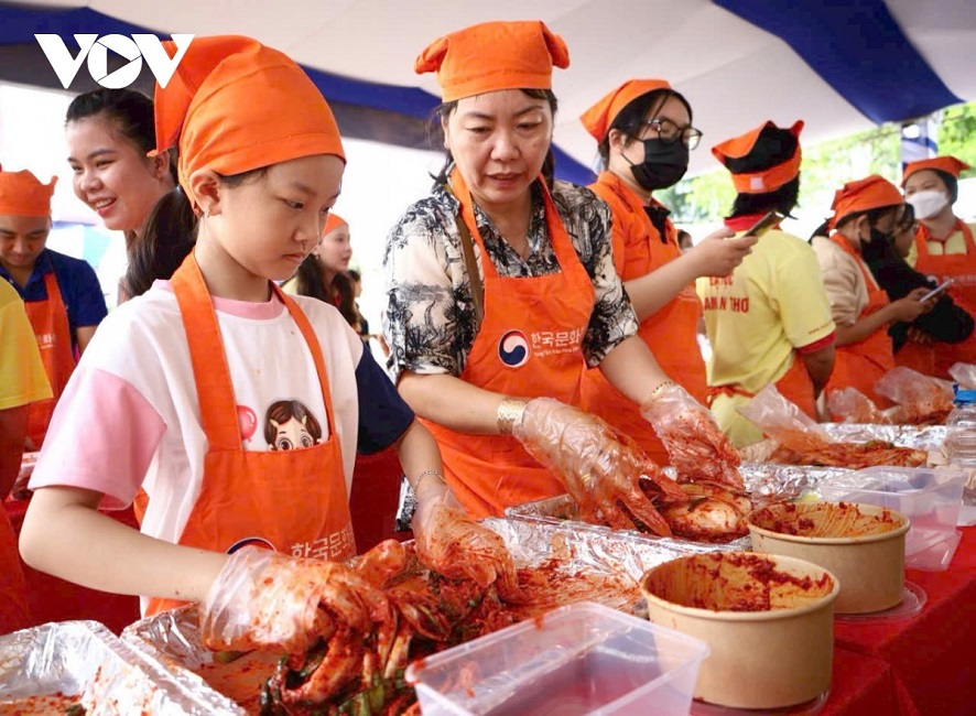 Người dân Cần Thơ làm món ăn đặc trưng của Hàn Quốc. Ảnh: Hồng Phương/VOV |