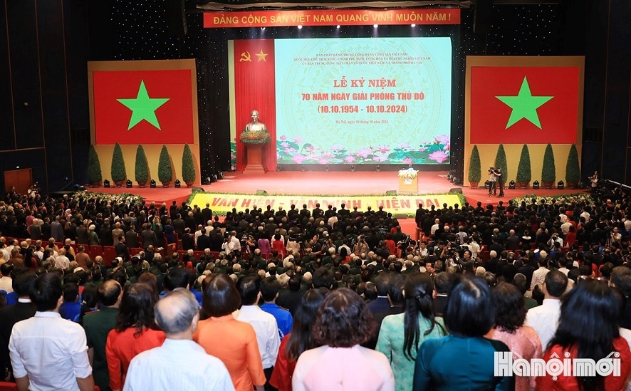 Sáng 10/10, tại Trung tâm Hội nghị quốc gia Hà Nội đã diễn ra lễ kỷ niệm cấp quốc gia 70 năm Ngày Giải phóng Thủ đô (10/10/1954 - 10/10/2024). Đây là sự kiện có ý nghĩa quan trọng nhất trong chuỗi hoạt động kỷ niệm 70 năm Ngày Giải phóng Thủ đô. Ảnh: hanoimoi.vn |