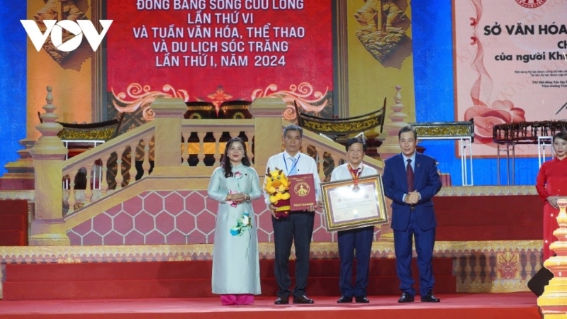 Lãnh đạo sở Văn hóa, Thể thao và Du lịch tỉnh Sóc Trăng nhận bằng xác lập kỷ lục trình diễn nhạc ngũ âm của người Khmer tỉnh Sóc Trăng có quy mô lớn nhất Việt Nam. Ảnh: VOV |