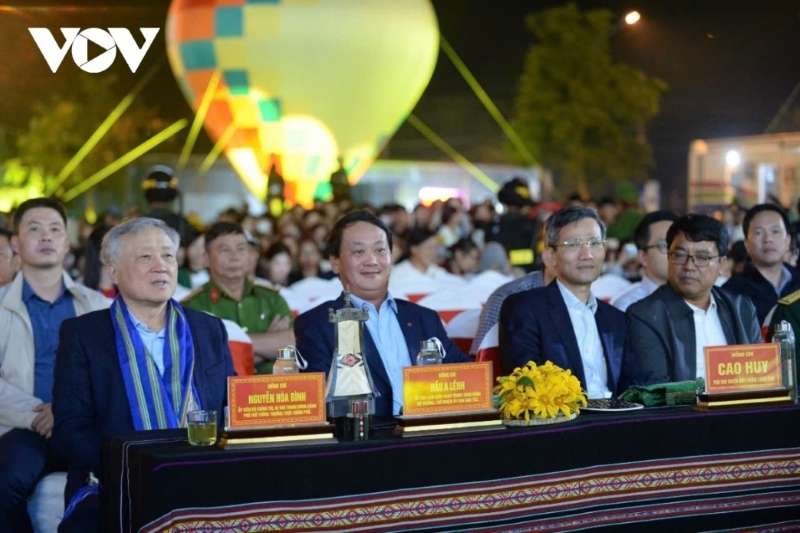 Phó Thủ tướng Thường trực Nguyễn Hòa Bình và Bộ trưởng, Chủ nhiệm Uỷ ban Dân tộc Hầu A Lềnh tham dự “Vũ khúc dã quỳ - Chư Đang Ya 2024”. Ảnh: VOV |