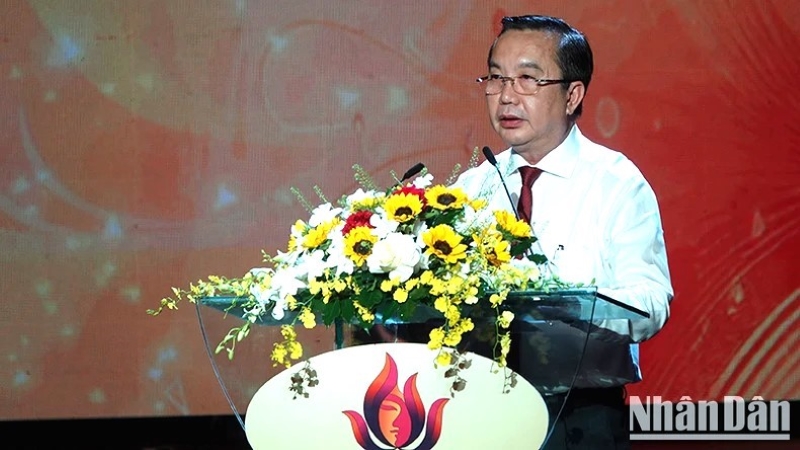 Phát biểu khai mạc Liên hoan, ông Trần Thế Thuận, Giám đốc Sở Văn hoá – Thể thao TP. Hồ Chí Minh, cho biết: “Liên hoan sân khấu lần này cũng là dịp để đánh giá cụ thể về chất lượng hoạt động, đội ngũ, công tác tổ chức biểu diễn… của sân khấu kịch thành phố, đồng thời, mong muốn tạo ra một sân chơi nghề nghiệp giàu tính chuyên môn cho các đơn vị kịch nói thành phố; tạo điều kiện thuận lợi cho văn nghệ sĩ tham gia cuộc thi nghề cấp quốc gia, từ đó góp phần định hướng hoạt động nghệ thuật, thúc đẩy các đơn vị xây dựng chương trình, tác phẩm ngày càng nâng cao chất lượng”. Ảnh: Báo Nhân Dân |