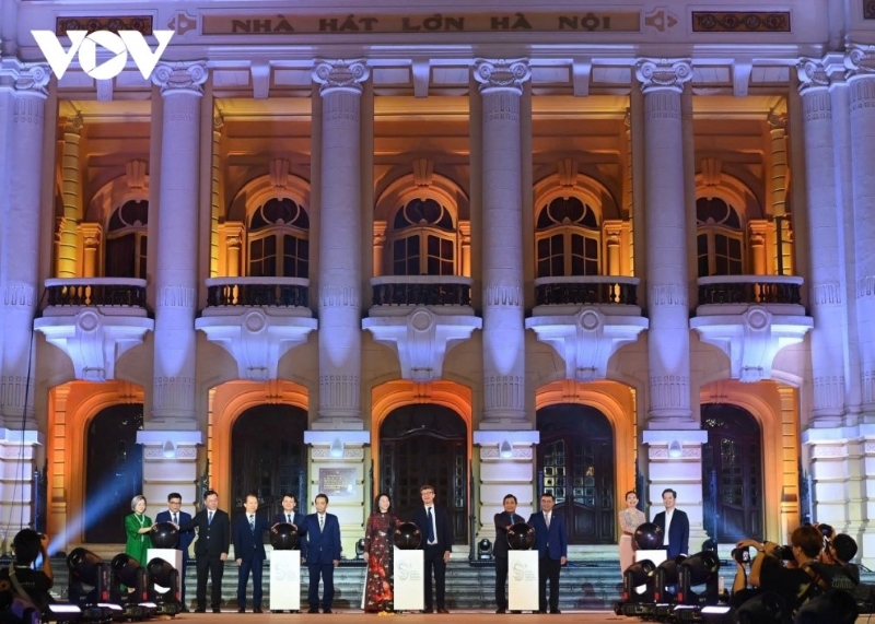 Các đại biểu thực hiện nghi thức khai mạc Lễ hội thiết kế sáng tạo Hà Nội năm 2024. Ảnh: VOV |
