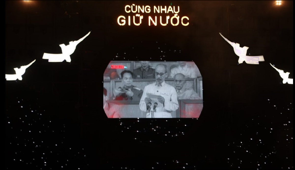 Trong khuôn viên quy mô 3.000 khán giả, các màn diễn thực cảnh đẹp mắt tái hiện dòng lịch sử đi đôi giữa dựng nước và giữ nước của dân tộc Việt Nam. (Trong ảnh: Một trong những tư liệu lịch sử về Chủ tịch Hồ Chí Minh được trình chiếu tại sự kiện. Ảnh: Minh Anh/Vietnam+) |
