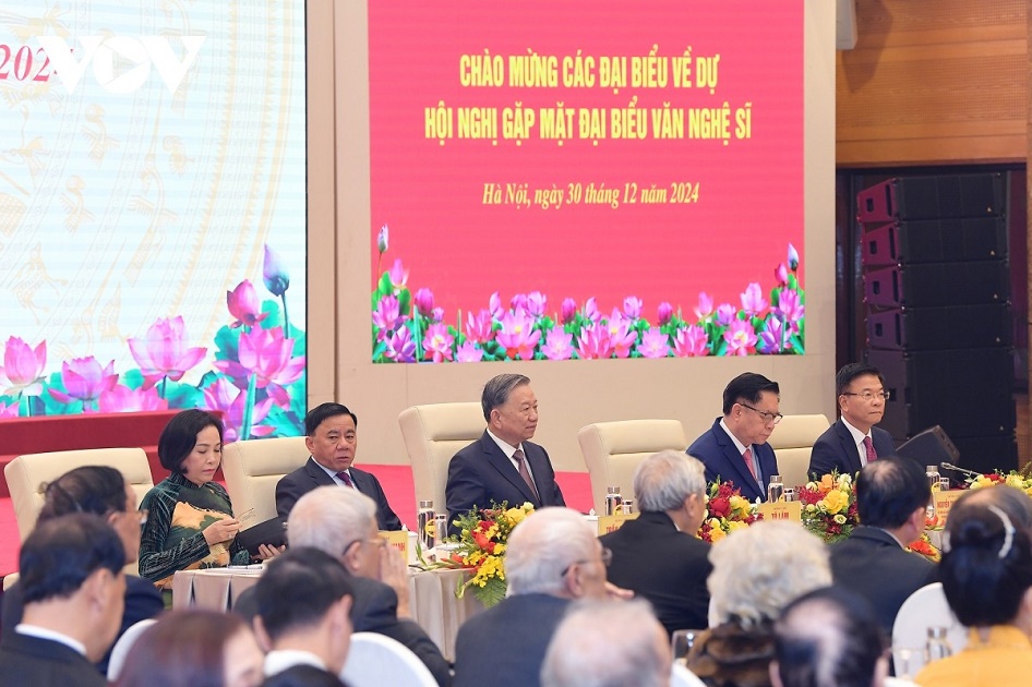 Chiều 30/12, Tổng Bí thư Tô Lâm có cuộc gặp thân mật với đại biểu văn nghệ sĩ. Lãnh đạo Đảng, Nhà nước và 200 đại biểu văn nghệ sĩ tham dự cuộc gặp. Ảnh: Hà Phương/VOV |