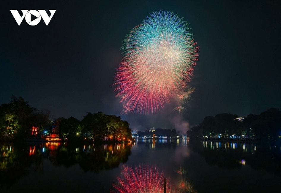 Bắn pháo hoa vào thời khắc giao thừa tại khu vực hồ Hoàn Kiếm, TP. Hà Nội. Ảnh: VOV |