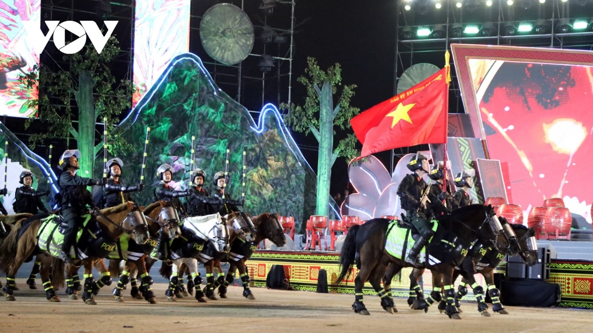 “Người truyền lửa - Lửa ấm Cao nguyên" là chương trình mang đậm dấu ấn của ngành Công an, giúp tạo ra sự gắn kết giữa Trung ương với địa phương và bà con các dân tộc. (Trong ảnh: Màn biểu diễn kỵ binh của lực lượng Công an tỉnh Đắk Lắk. Ảnh: Tuấn Long/VOV) |