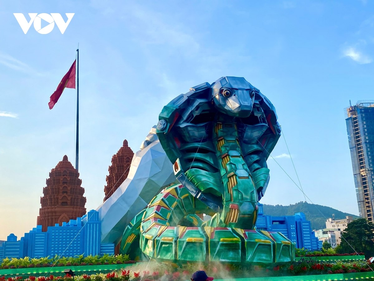 Rắn công nghệ - ý tưởng độc đáo tại cụm biểu tượng linh vật năm Ất Tỵ 2025. Theo ông Phạm Anh Tuấn, Chủ tịch UBND tỉnh Bình Định, rắn công nghệ được hình tượng hóa như một sự vươn lên, thể hiện sức mạnh của công nghệ. Ảnh: VOV |