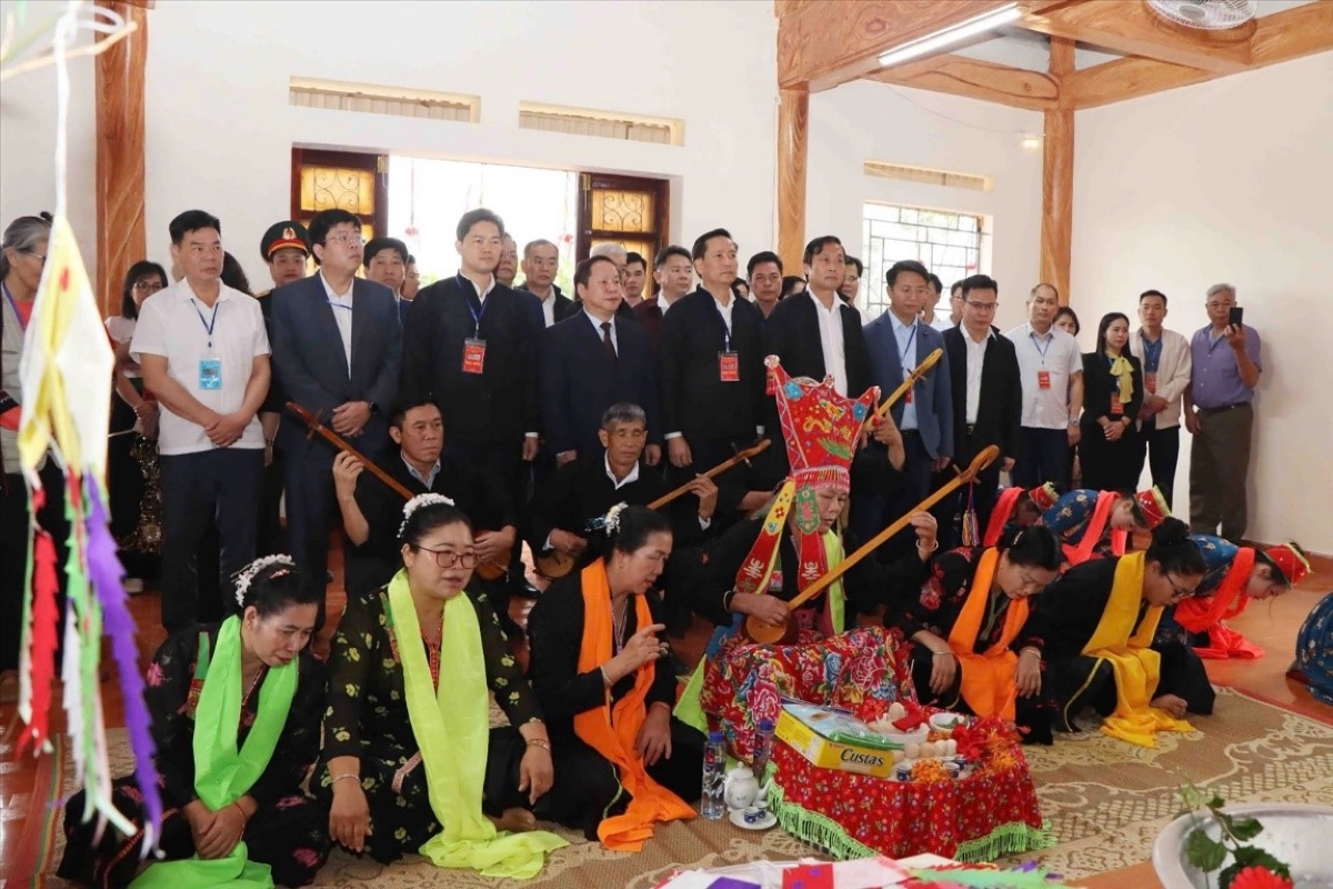 Các đại biểu tham dự nghi thức dâng hương tại nhà Then. Ảnh: baodantoc.vn |