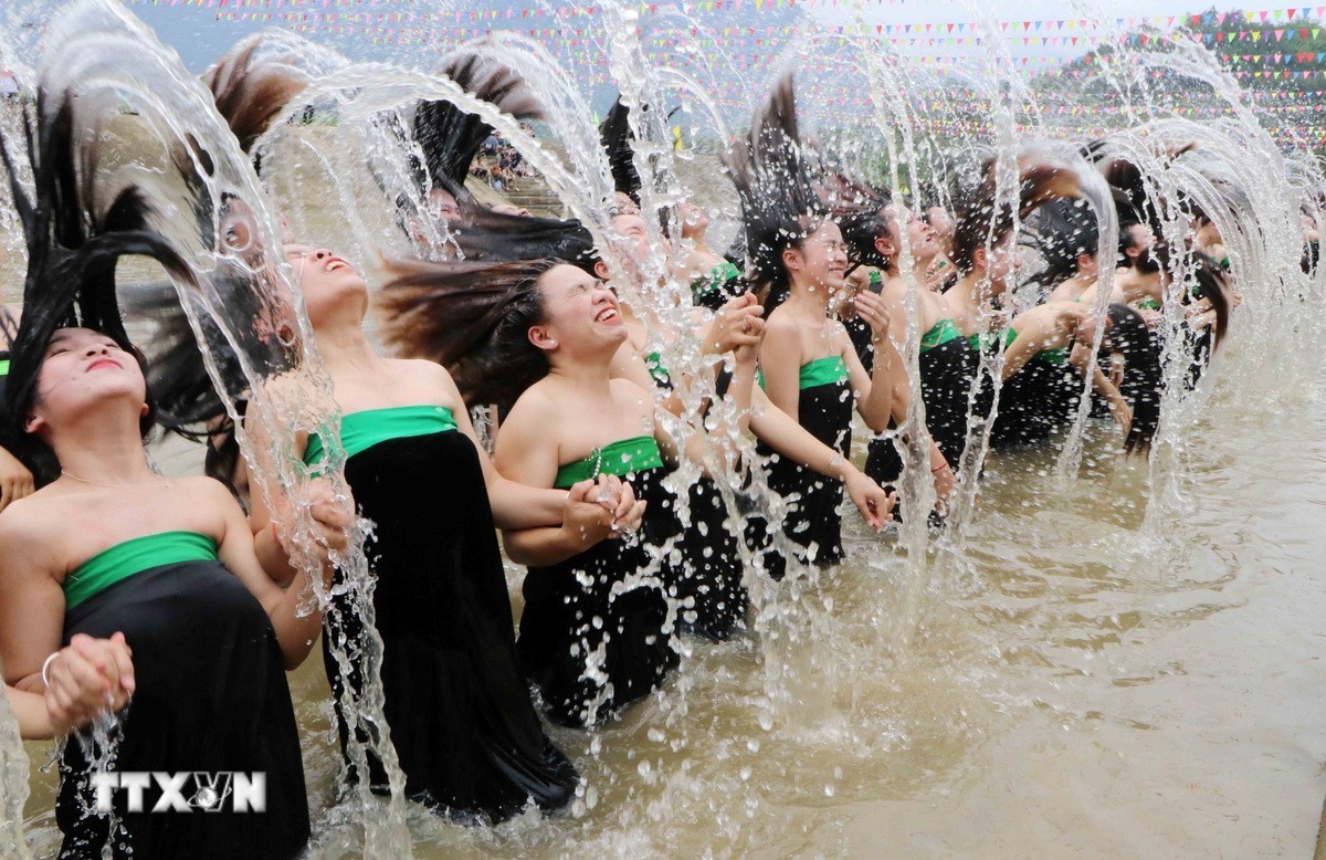 Tái hiện tục gội đầu của người Thái tại lễ hội. Ảnh: Nguyễn Oanh/TTXVN |