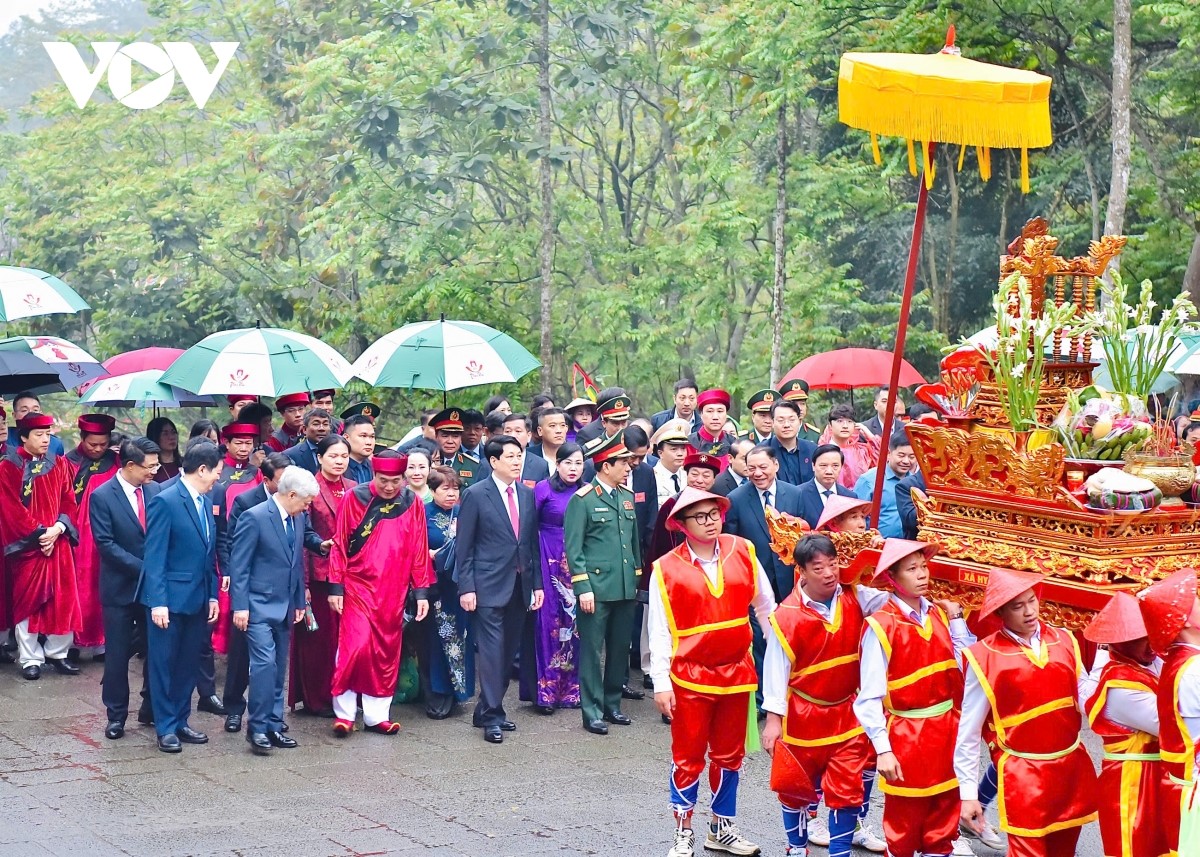 Dự lễ dâng hương có Chủ tịch nước Lương Cường, Chủ tịch Ủy ban Trung ương Mặt trận Tổ quốc Việt Nam Đỗ Văn Chiến, Bộ trưởng Bộ Quốc phòng Phan Văn Giang, lãnh đạo các Bộ, ban, ngành Trung ương và tỉnh Phú Thọ cùng đông đảo đại diện các tầng lớp nhân dân và kiều bào. Ảnh: VOV |