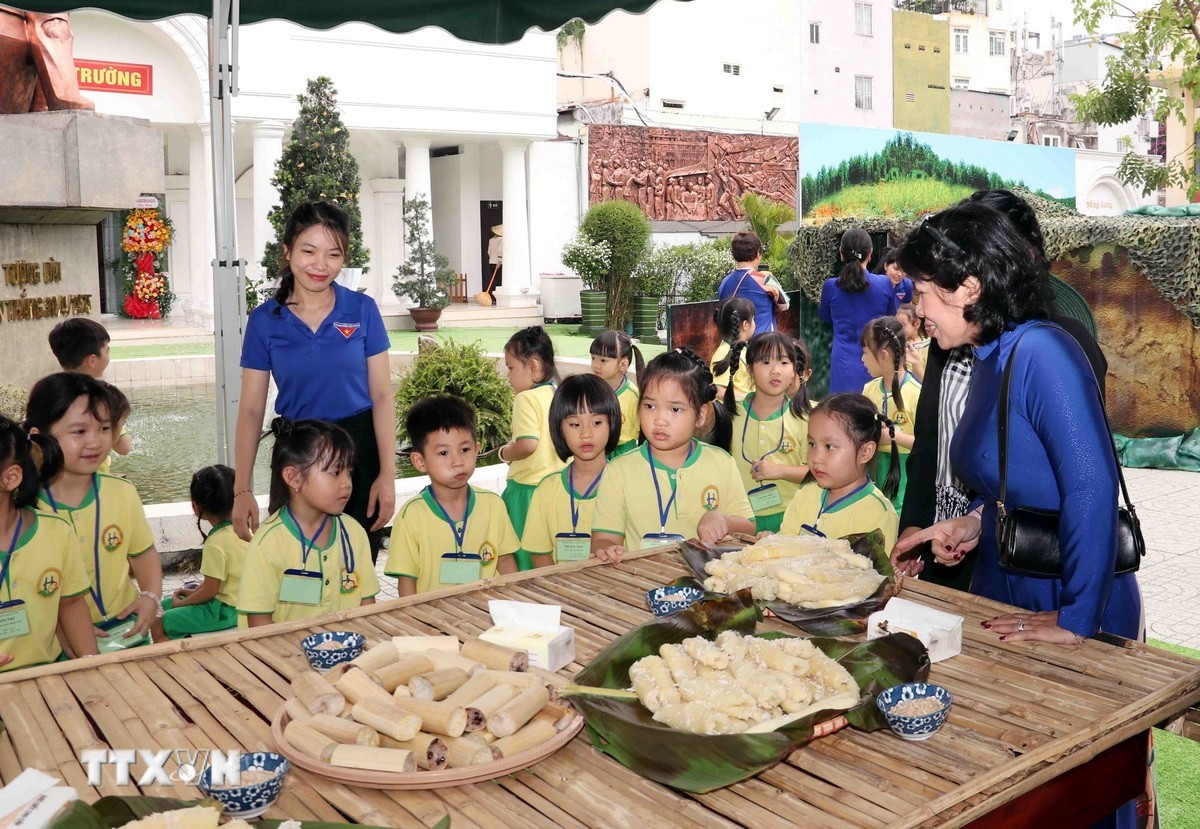 Giới thiệu các món ăn du kích trong kháng chiến cho các em nhỏ tại triển lãm. Ảnh: Xuân Khu/TTXVN |