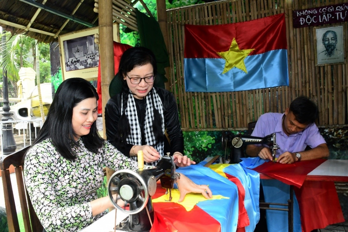Khách tham quan trải nghiệm hoạt động may cờ giải phóng. Ảnh: baoquankhu7.vn |