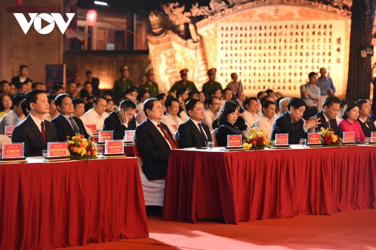 Tối 13/4, UBND thành phố Từ Sơn (Bắc Ninh) tổ chức Lễ kỷ niệm 1015 năm ngày Lý Thái Tổ đăng quang Hoàng đế (15/3 năm Canh Tuất 1010 - 15/3 năm Ất Tỵ 2025) và nhận Bằng xếp hạng Di tích quốc gia đặc biệt đối với Đình Đình Bảng, Bằng xếp hạng Di tích quốc gia đối với Nhà lưu niệm Chủ tịch Quốc hội Lê Quang Đạo và Quyết định công nhận Bảo vật quốc gia đối với ấn vàng "Hoàng đế chi bảo". Ảnh: VOV |