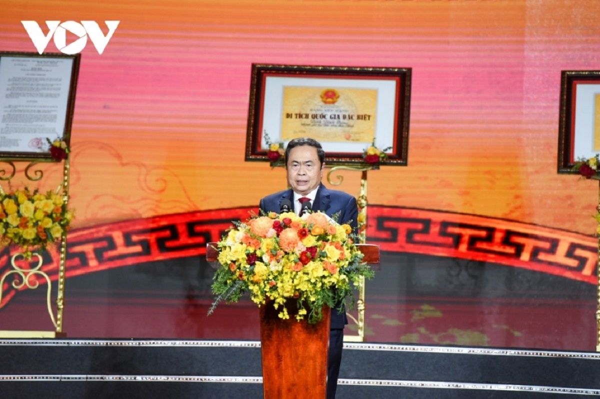 Chủ tịch Quốc hội Trần Thanh Mẫn trao Bằng xếp hạng Di tích quốc gia đặc biệt Đình Đình Bảng, Di tích quốc gia Nhà Lưu niệm Chủ tịch Quốc hội Lê Quang Đạo; Quyết định công nhận Bảo vật quốc gia ấn vàng “Hoàng đế chi bảo” cho lãnh đạo TP. Từ Sơn, tỉnh Bắc Ninh. Ảnh: VOV |