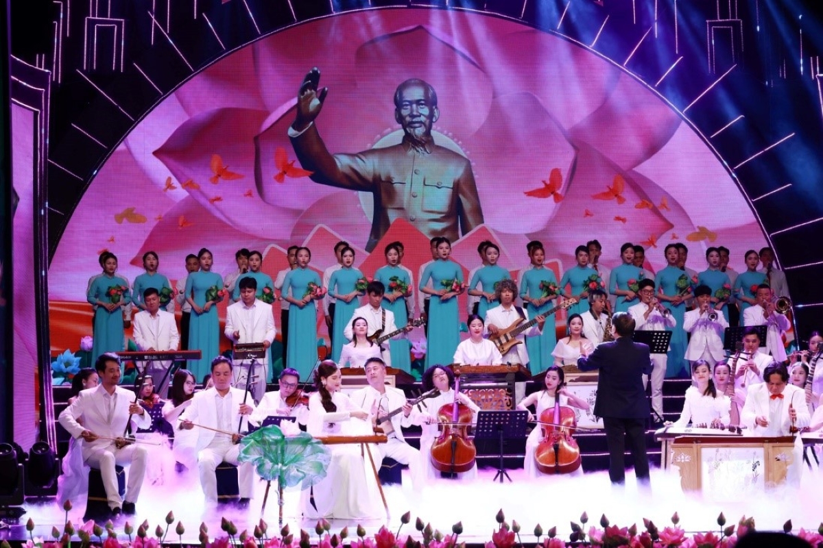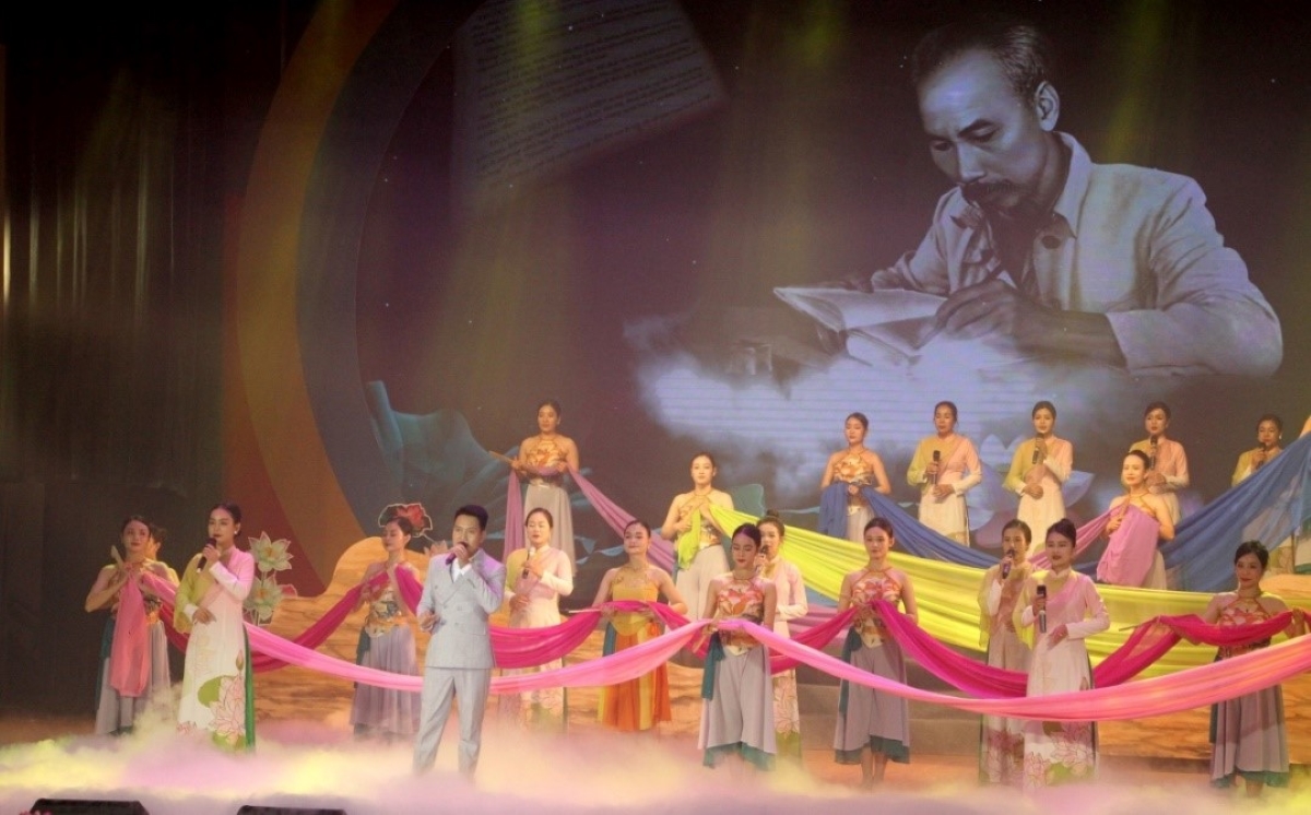 “Quà tháng 5 dâng Người” là chương trình nghệ thuật mang ý nghĩa chính trị, văn hóa sâu sắc, thể hiện tri ân sâu nặng và tình cảm kính yêu vô hạn của nhân dân cả nước đối với Chủ tịch Hồ Chí Minh - vị lãnh tụ vĩ đại, Anh hùng giải phóng dân tộc, nhà văn hóa kiệt xuất. Ảnh: Ban tổ chức |