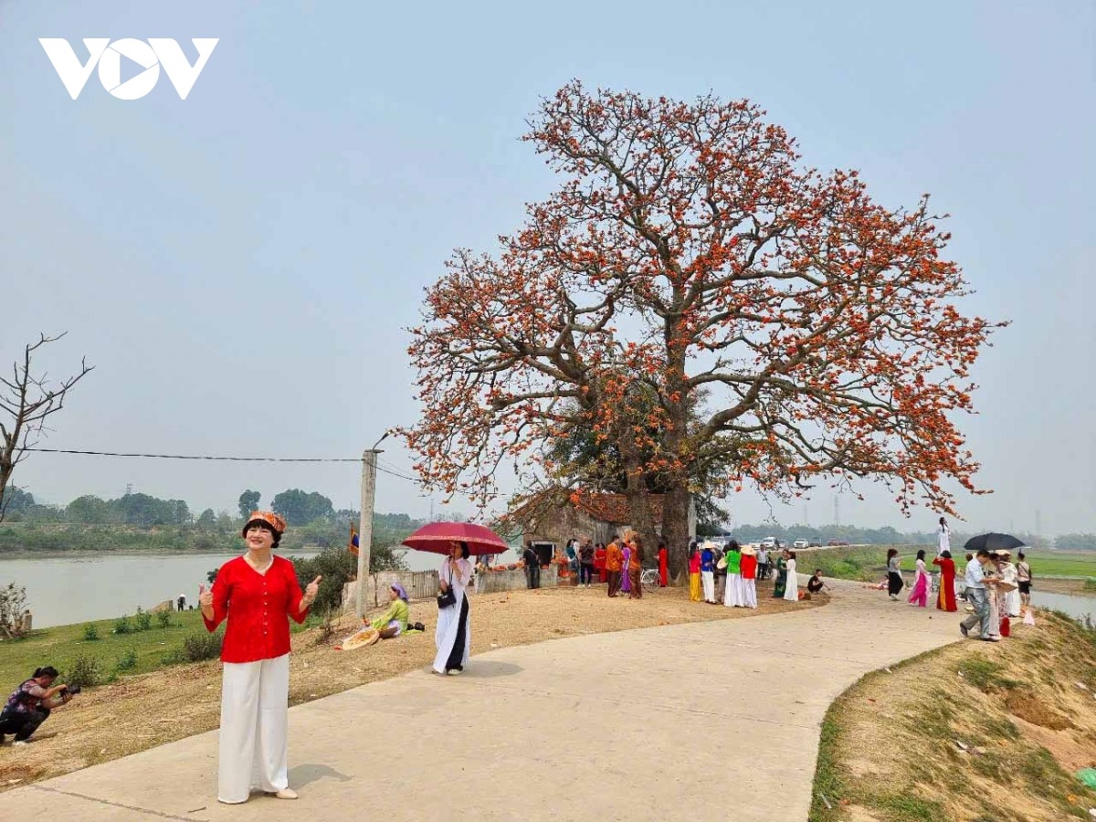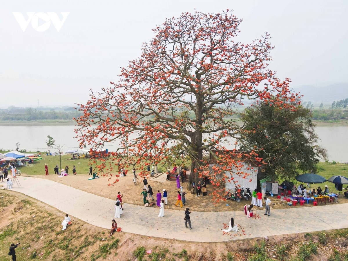 Hoa của cây gạo có màu đỏ nghệ, rực cả triền đê. Bên cạnh là dòng sông Thương êm đềm. Bức hoạ đồng quê hiện lên đầy thơ mộng. Chẳng ai biết chính xác cây gạo cô đơn này có từ bao giờ nhưng theo một số người dân nơi đây, cây gạo đã có khoảng trên 200 năm. |