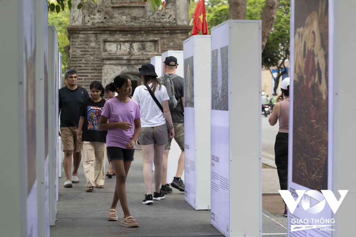 | Du khách đến xem một triển lãm ảnh được tổ chức ngoài trời, trên phố đi bộ hồ Hoàn Kiếm. |