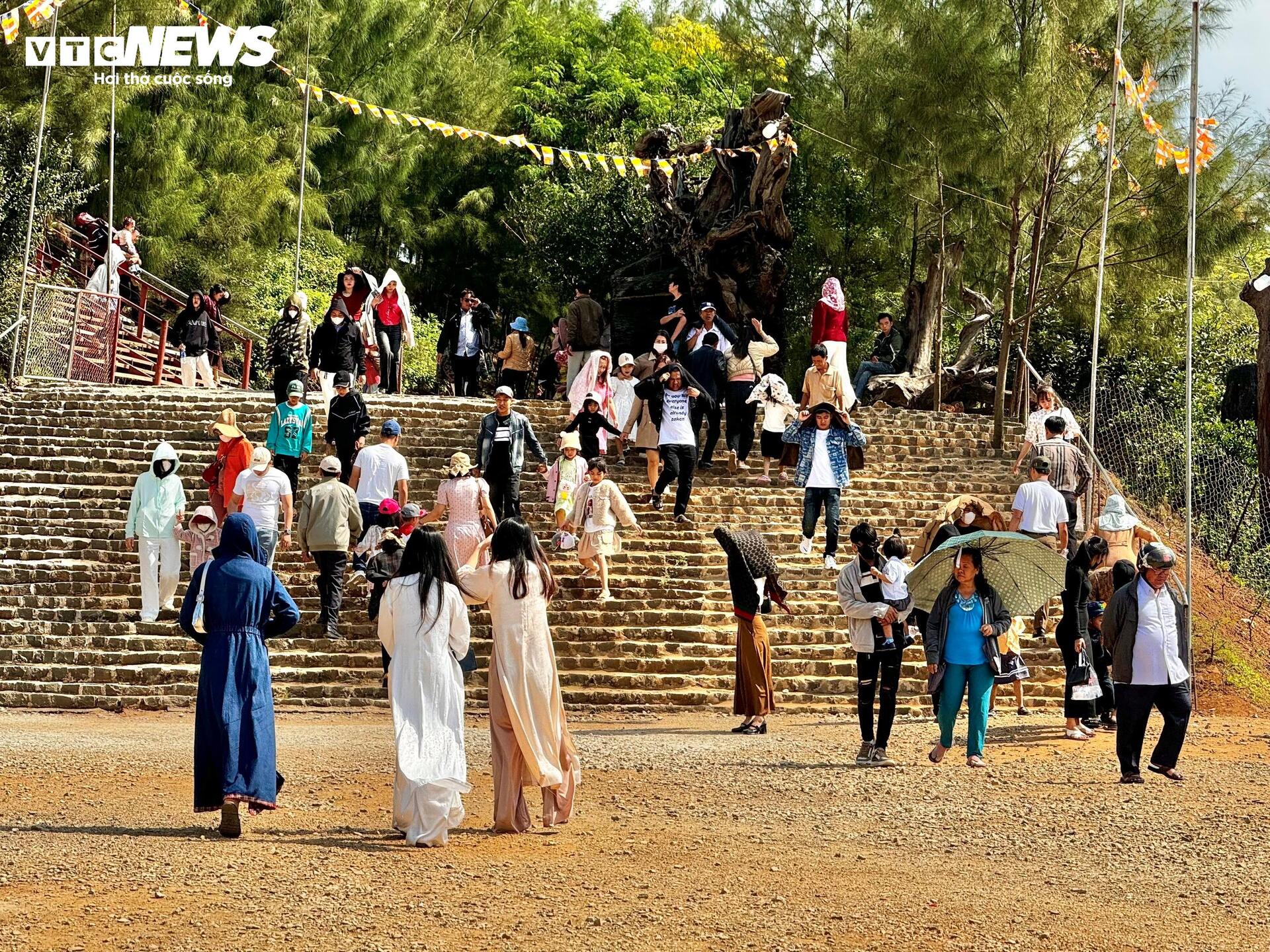 | Chiều 3/2 (mùng 6 Tết), nhiều du khách đội nắng để vào viếng chùa và mục sở thị công trình tượng Phật Quan Âm cao nhất Đông Nam Á. |