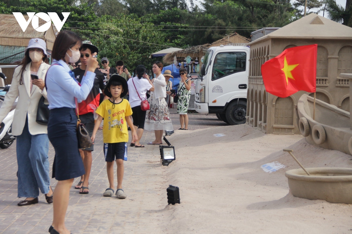 Người dân, du khách thích thú check-in mô hình cát. |