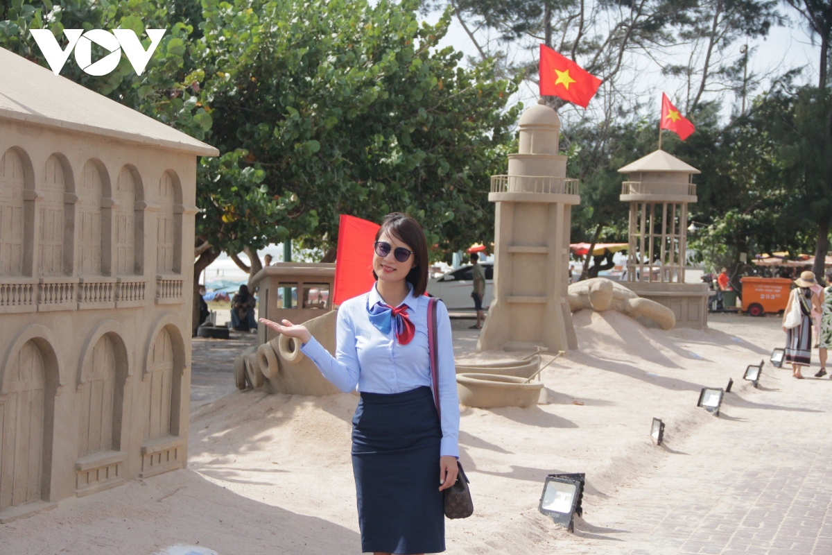 Nhiều bạn trẻ thích thú với mô hình cát, tranh thủ lưu lại những tấm ảnh. |