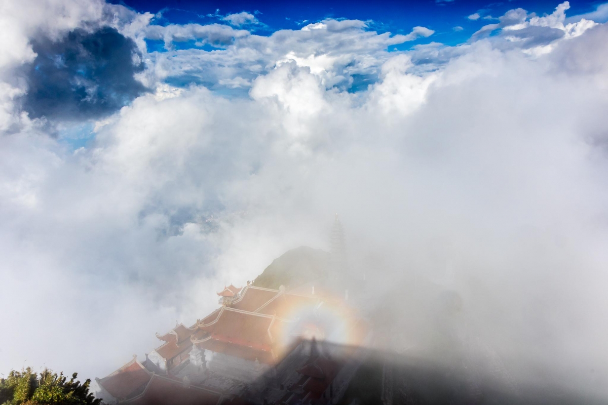 Ảnh: Tô Bá Hiếu. Mùa săn mây, du khách còn có thể được nhìn thấy hiện tượng phát quang trên khu vực đỉnh, ngay tại vị trí tượng Quan Thế Âm Bồ Tát hay Kim Sơn Bảo Thắng tự. Nhiều người cho rằng ai có may mắn nhìn thấy hiện tượng này khi đến cầu an tại quần thể tâm linh nơi mạch nguồn linh thiêng tại đỉnh Fansipan thì sẽ gặp dữ hoá lành, làm gì cũng suôn sẻ. |