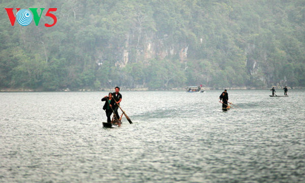 Trong chuyến du xuân miền Đông Bắc, qua Hồ Ba Bể, tôi đã có một hành trình mênh mang như thế. Trên lênh đênh sóng nước, dập dềnh nhè nhẹ mái chèo đơn, chiếc thuyền độc mộc đưa tôi nhẹ trôi bên dáng áo chàm của cô gái Tày duyên dáng, tay chèo dẻo như đang trong một điệu múa nơi vùng đất “thanh sơn bích thủy” có một không hai này.