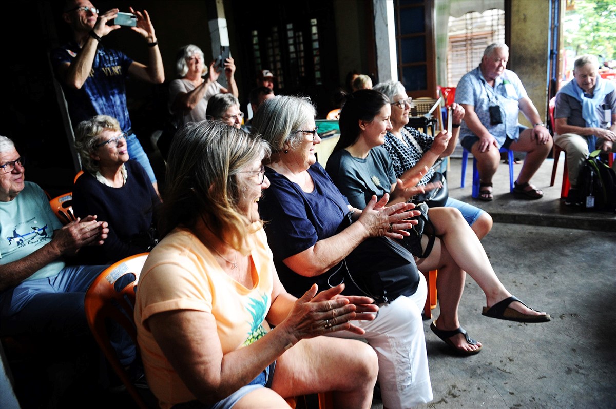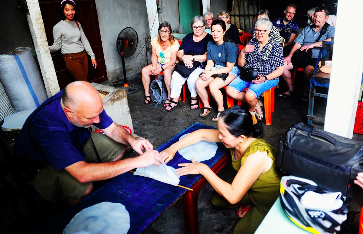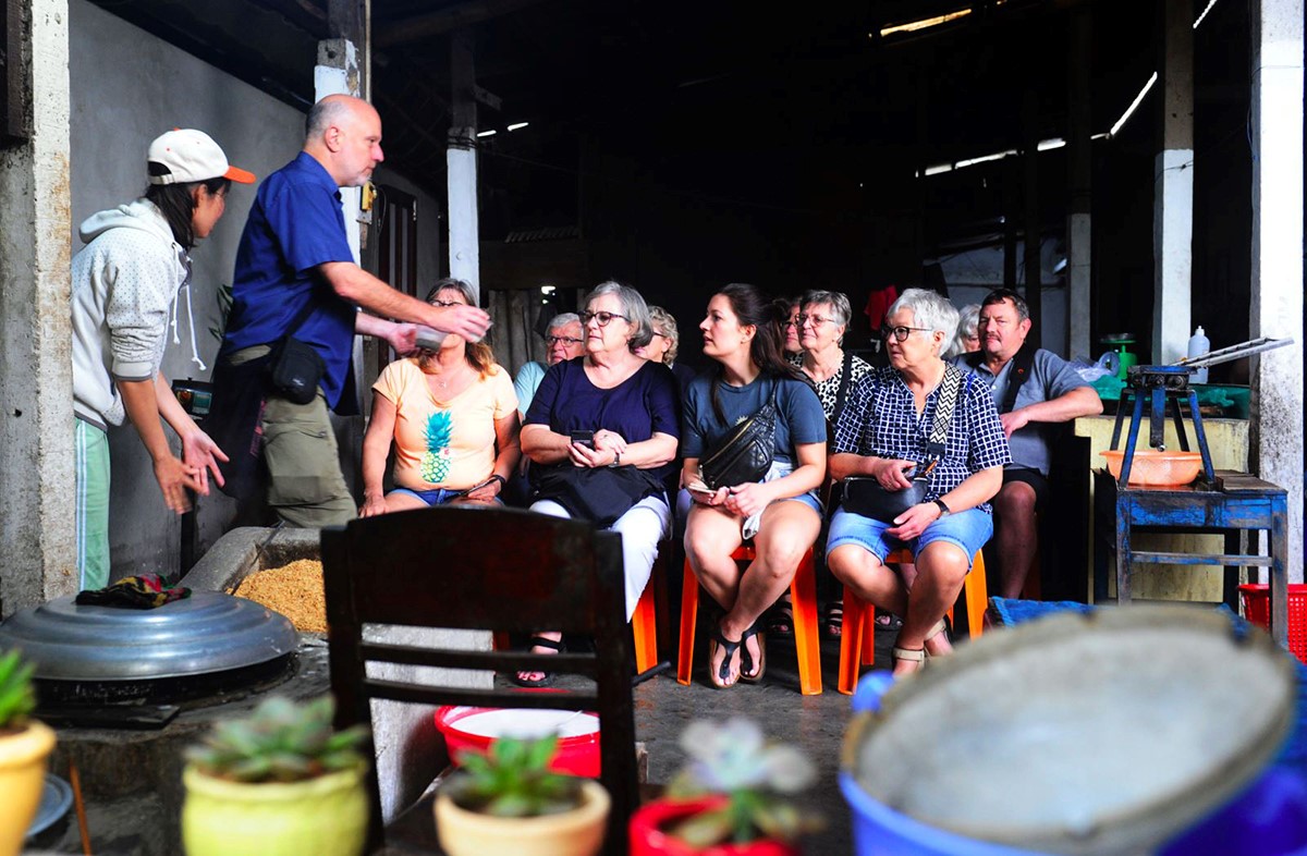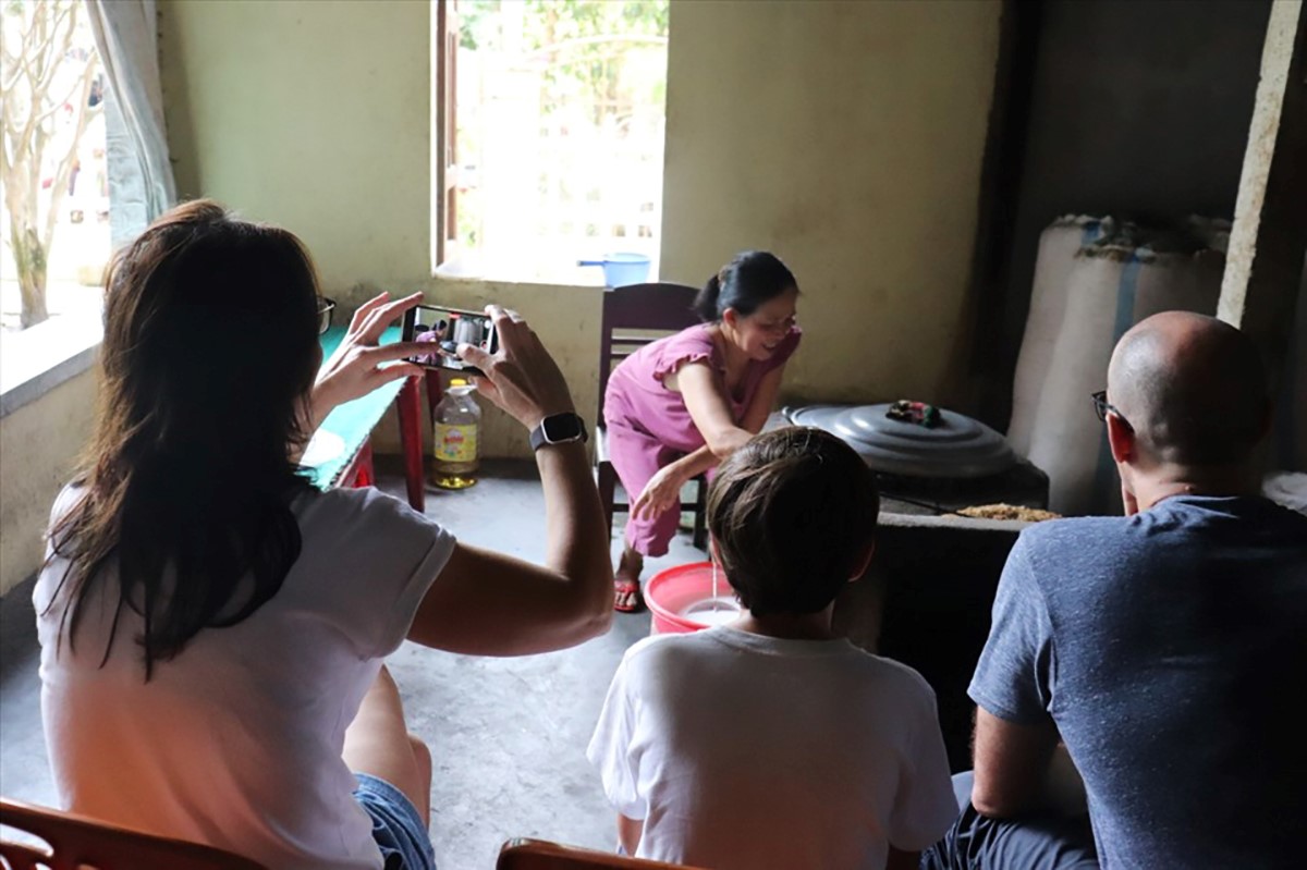 Bà An (thứ 2, từ trái) giới thiệu lò trấu tráng mì với khách du lịch. Ảnh: Nguyễn Linh/laodong.vn |