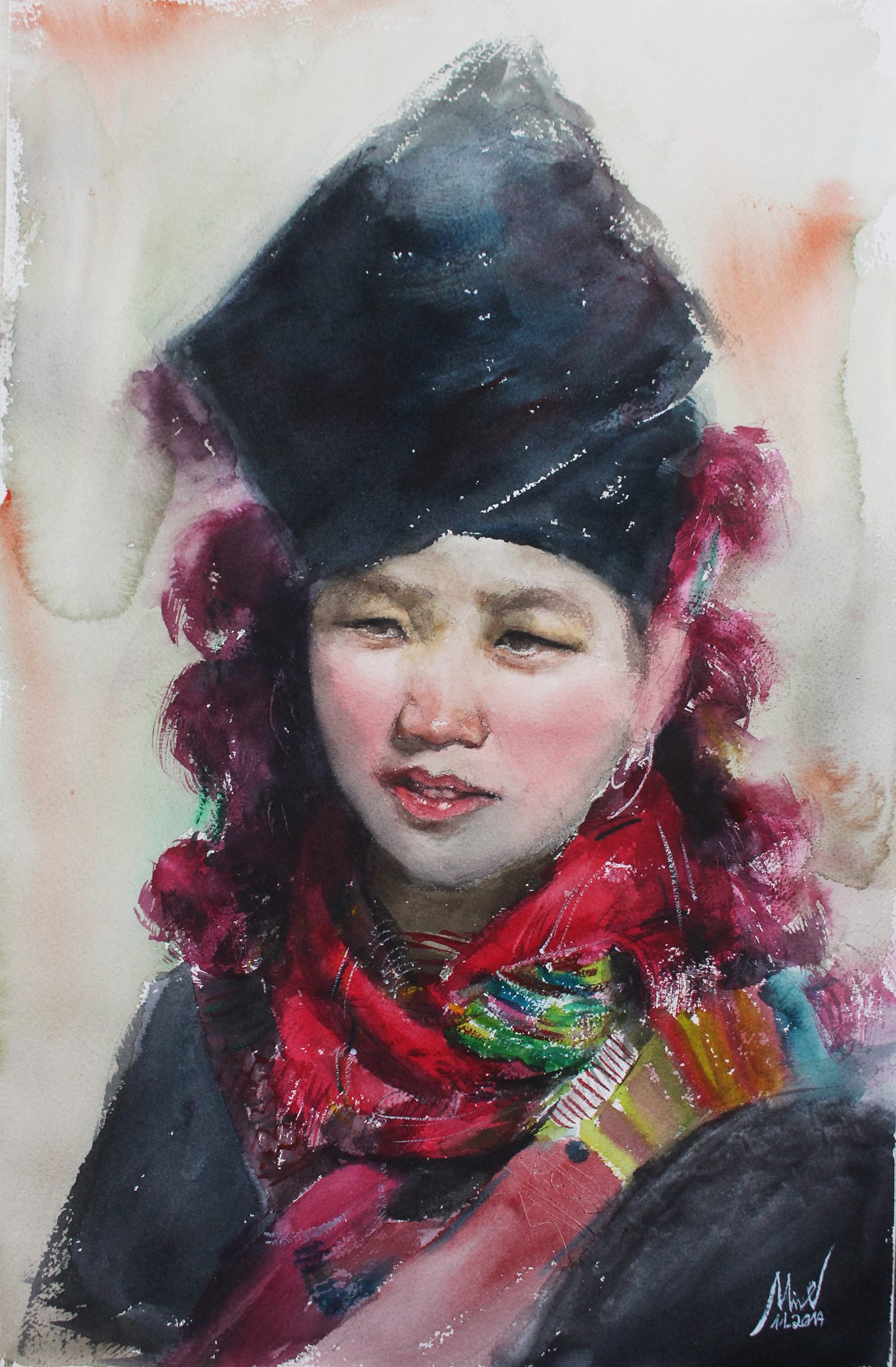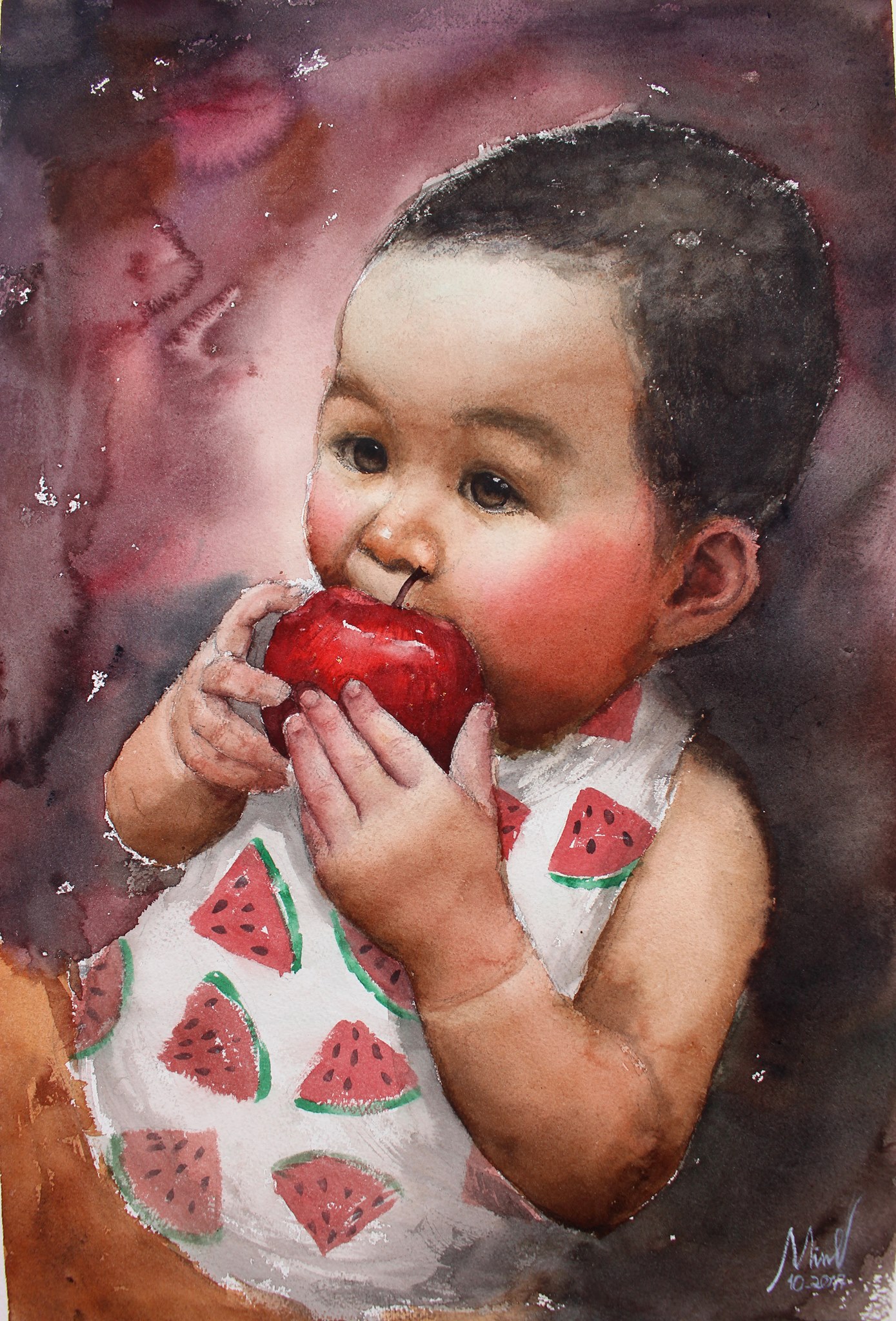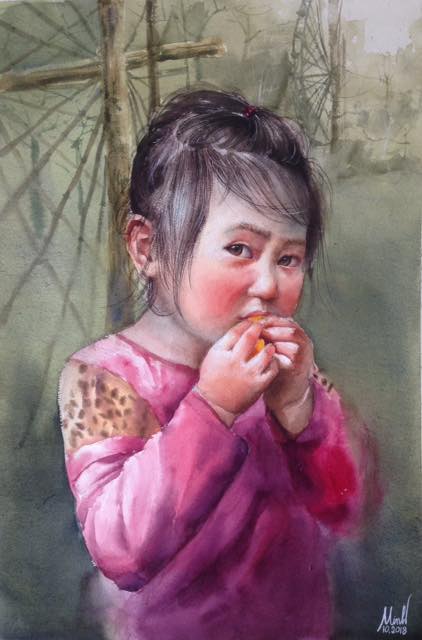 Bức tranh chân dung em bé của thầy Vũ Minh được trưng bày tại Triển lãm màu nước quốc tế IWS 2017. |