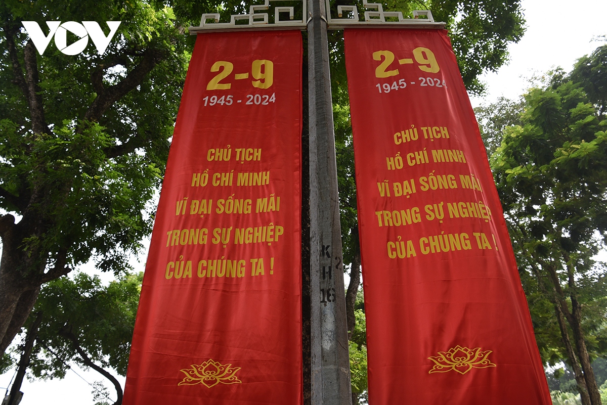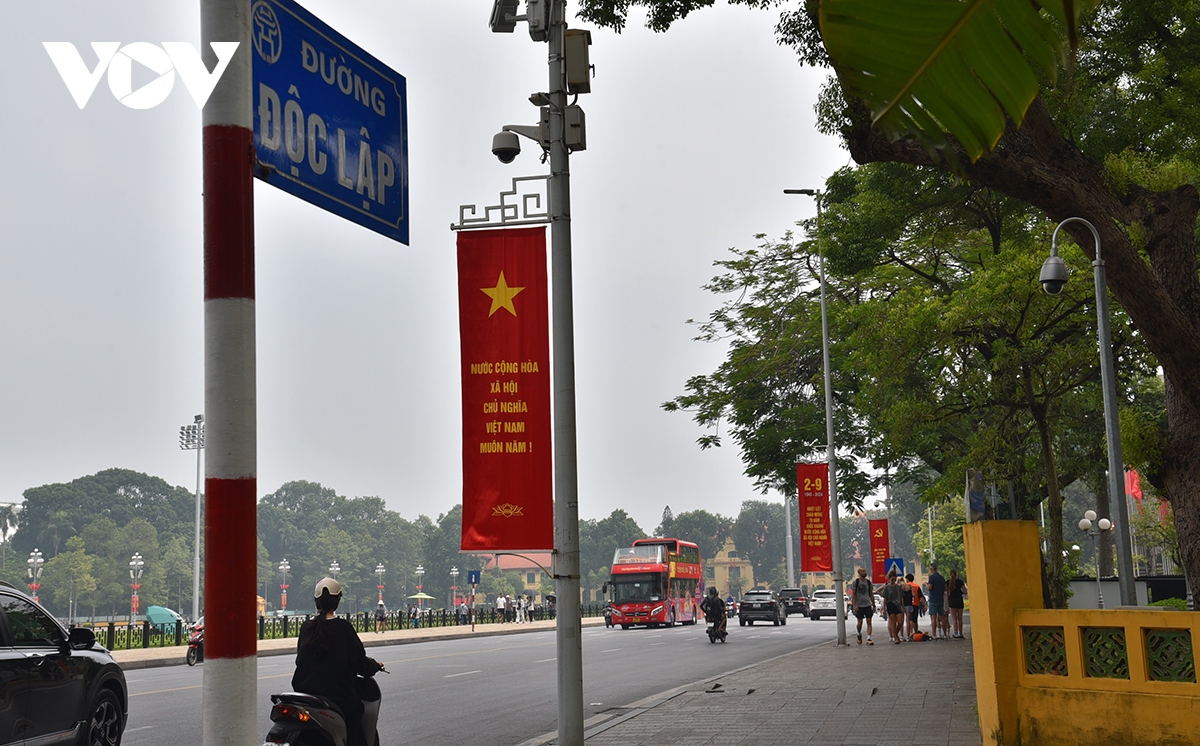 Đường phố Thủ đô Hà Nội rực rỡ cờ hoa, pa nô, biểu ngữ chào mừng 79 năm Cách mạng Tháng Tám và Quốc khánh (2/9/1945 - 2/9/2024). |