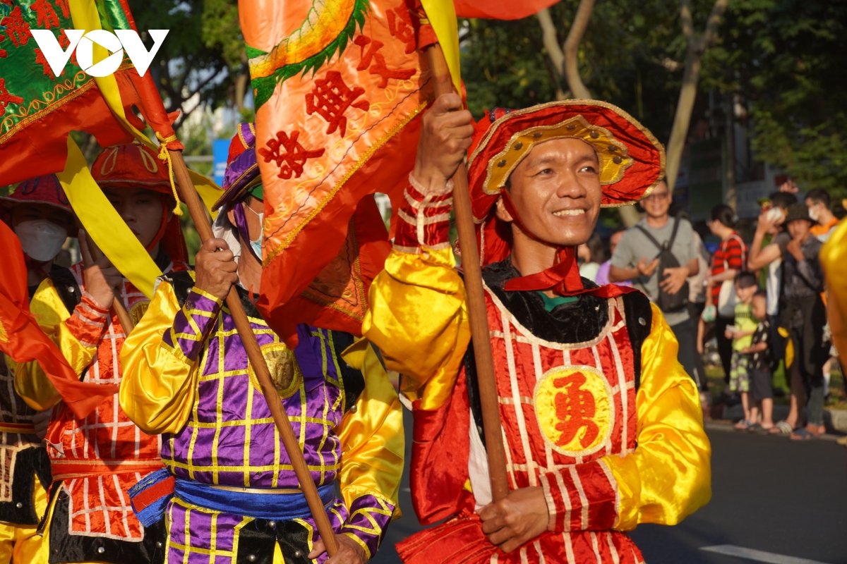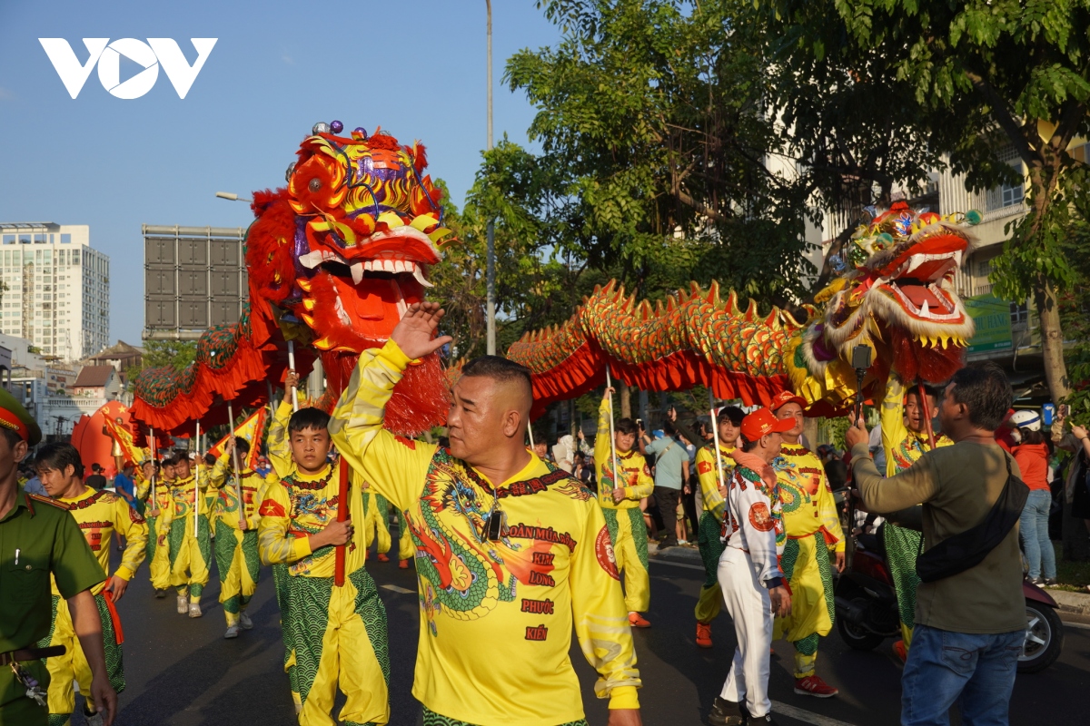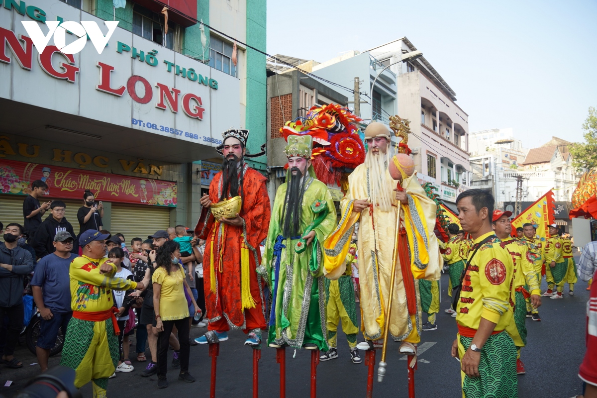 Các diễn viên mặc các trang phục tập quán đặc trưng của người Hoa, kết hợp với biểu diễn tiết mục Lân sư rồng diễu hành trên đường phố Quận 5