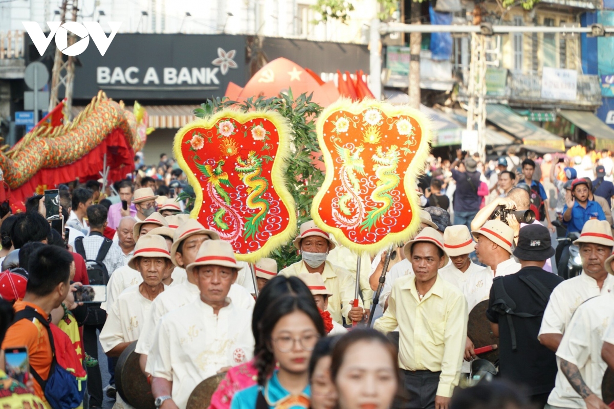 Đoàn diễu hành biểu diễn những tiết mục như múa lân, múa quạt, cà kheo,...
