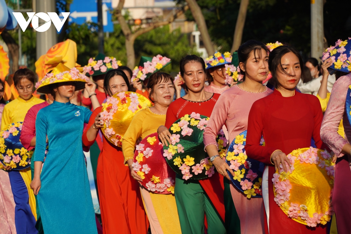 Ngoài trang phục của người Hoa, người dân cũng mặc áo dài tham gia diễu hành qua các tuyến phố