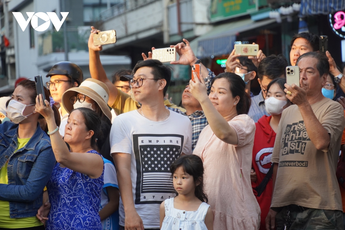 Nhiều người dân tập trung dọc 2 bên đường các tuyến phố kéo dài từ đường Hải Thượng Lãn Ông - Châu Văn Liêm - Lão Tử - Lương Nhữ Học - Nguyễn Trãi - Trần Xuân Hòa - Trần Hưng Đạo - Trung tâm Văn hóa Quận 5 để xem và chụp hình