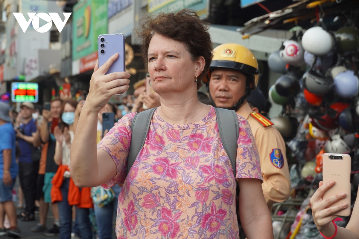 Nhiều du khách nước ngoài cũng tranh thủ ghi lại hình ảnh khi đoàn diễu hành nghệ thuật đi qua