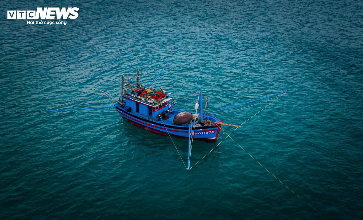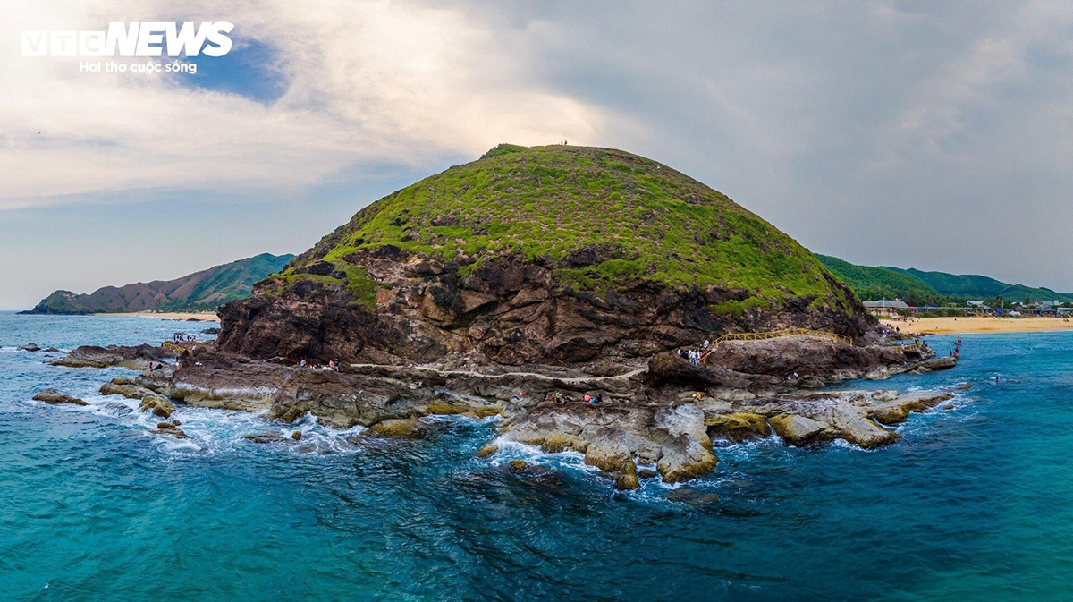 Từ trên cao, màu xanh ngọc của nước biển bao quanh ghềnh đá, sóng vỗ nhẹ nhàng vào vách núi trắng xóa tạo nên bức tranh biển trời hùng vĩ. |