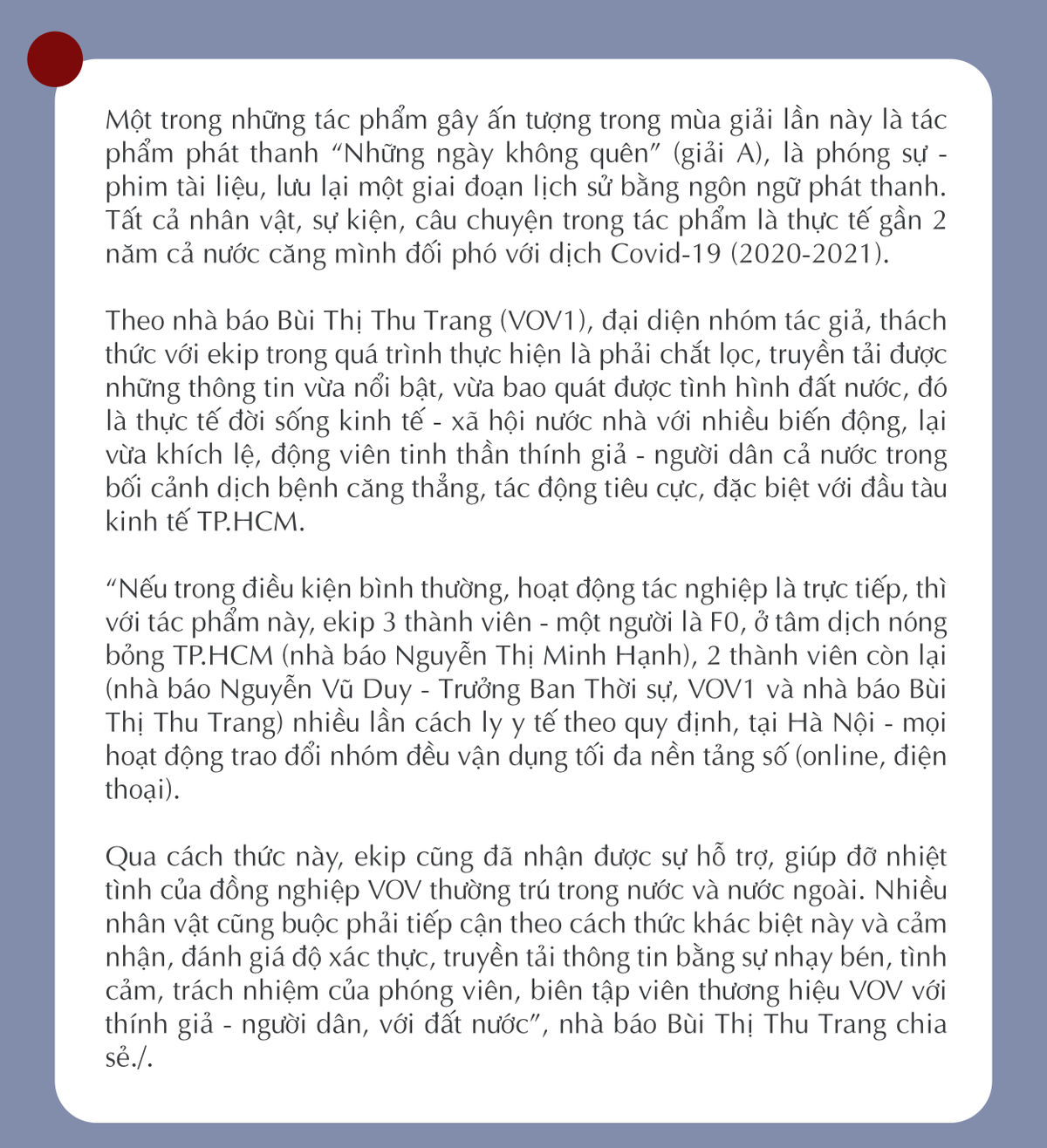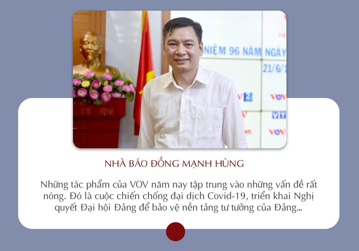Theo ông Phạm Mạnh Hùng, Phó Tổng Giám đốc VOV kiêm Chủ tịch thường trực Liên chi Hội Nhà báo VOV, năm 2021, đại dịch COVID-19 bùng phát trở lại gây sức ép về điều kiện tác nghiệp, rủi ro nhưng cũng mang lại những cơ hội cho các nhà báo trong việc dấn thân vào đời sống, khắc phục những khó khăn, hiểm nguy để có mặt vùng tâm dịch, đồng hành cùng với đội ngũ cán bộ y, bác sĩ, các lực lượng tuyến đầu trong chống dịch. Cũng nhờ vậy đội ngũ phóng viên của VOV đã có nhiều tác phẩm báo chí rất sống động, phản ánh sinh động thực tiễn cũng như đau thương, mất mát của nhân dân.