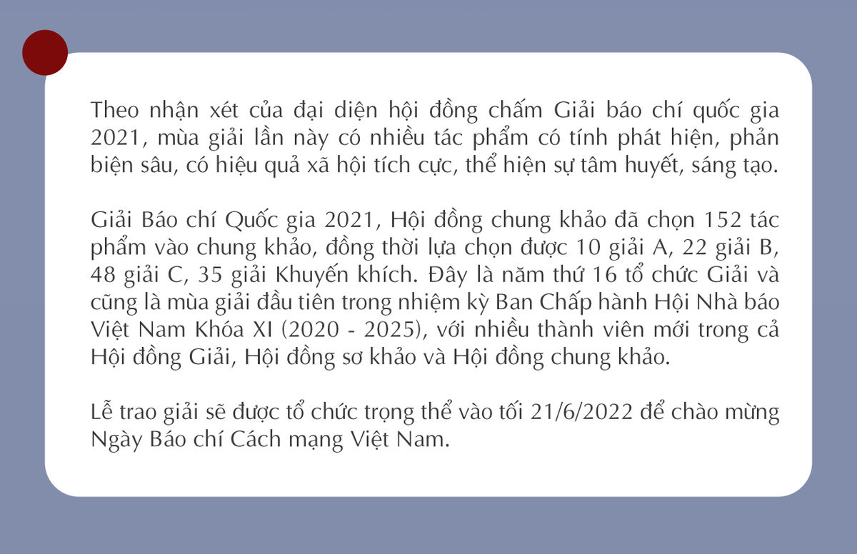 Nhà báo Lê Quốc Minh - Ủy viên Ban Chấp hành Trung ương Đảng,Tổng Biên tập Báo Nhân Dân, Chủ tịch Hội Nhà báo Việt Nam, Chủ tịch Hội đồng chung khảo cho biết, số lượng tác phẩm báo chí dự thi Giải báo chí Quốc gia 2021 cao so với các năm trước. Điểm nhận thấy rõ nhất năm nay là khoảng cách chất lượng giữa các cơ quan báo chí Trung ương, ngành và địa phương đã được thu hẹp.Đặc biệt trong lĩnh vực truyền hình, nhiều giải cao đã thuộc về các cơ quan báo chí của địa phương, các nội dung báo in cũng thay đổi vị trí ngôi, bậc giữa các cơ quan báo chí.