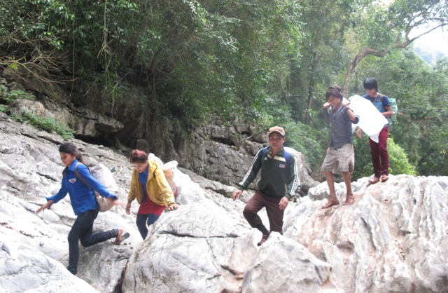 | Đường vào bản Dốc Mây cheo leo với đá tai mèo lởm chởm. |