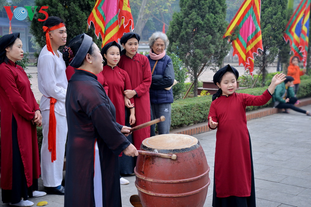 | Tại sân đình, những nghệ sĩ lại cùng khán giả ngâm thơ, hát xẩm... giới thiệu tới du khách những nét đẹp trong Tết Việt truyền thống. |
