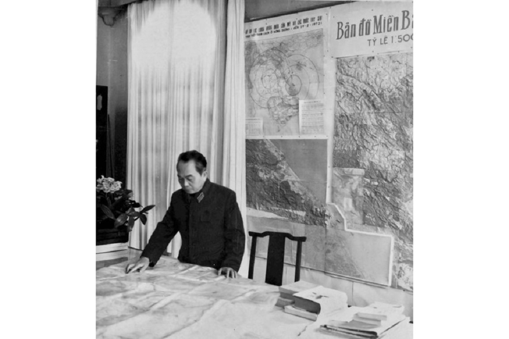 Đại tướng Võ Nguyên Giáp tại phòng làm việc tầng 2 Nhà Con Rồng, trước năm 1968. Nguồn: Bảo tàng Lịch sử Quân sự Việt Nam. |